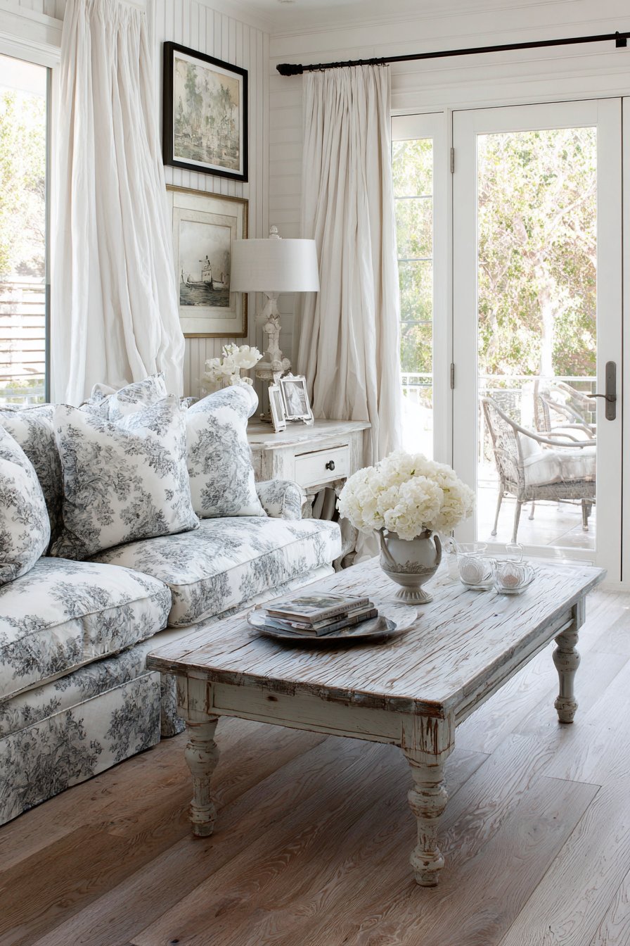 Antique white furniture throughout the living room reinforces the provincial aesthetic, its distressed finish suggesting pieces collected over generations rather than purchased all at once. Toile patterns—the classic French fabric featuring pastoral scenes rendered in single-color line drawings—appear on cushions and upholstery, their narrative quality adding visual interest while maintaining the blue-and-white or red-and-white color schemes traditional to the style. A weathered wood coffee table with turned legs bears the marks of use, its surface patina testifying to decades of service. These collected elements create an interior that feels inherited and treasured rather than decorated.