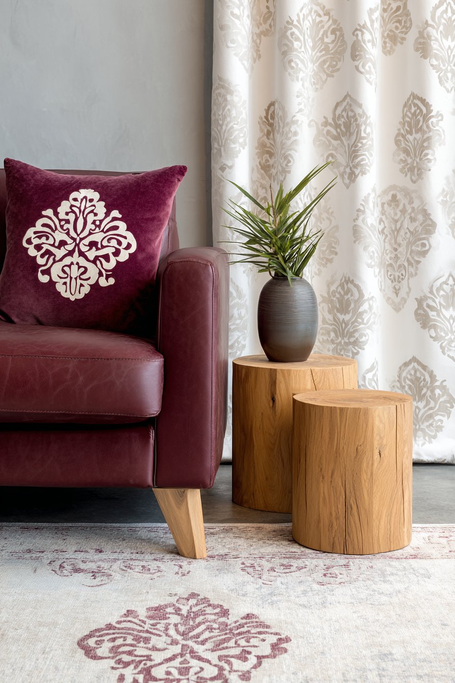 - Layer multiple textile types and patterns while anchoring the scheme with white curtains that provide visual rest