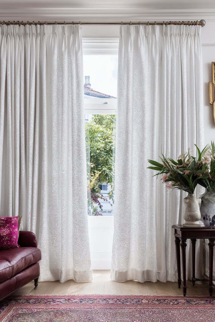 This design approach demonstrates how white curtains can enhance rather than diminish formality. The pristine white silk provides a clean, sophisticated backdrop that allows other luxurious elements to shine while contributing its own beauty through fabric quality and expert tailoring. The pleated heading creates architectural interest at the top of the window, while the generous fabric fullness ensures beautiful draping throughout the length. During evening gatherings, interior lighting reflects off the silk’s surface, creating a warm glow that enhances the room’s welcoming yet elegant atmosphere.