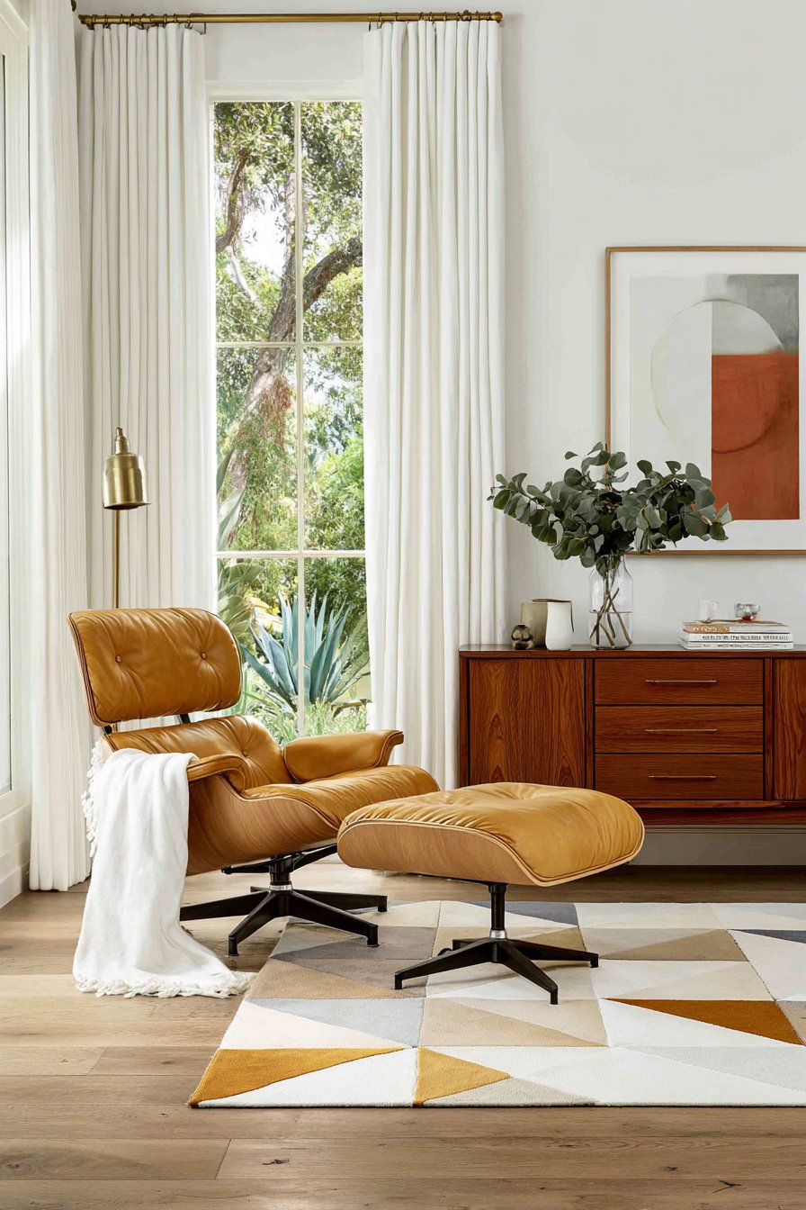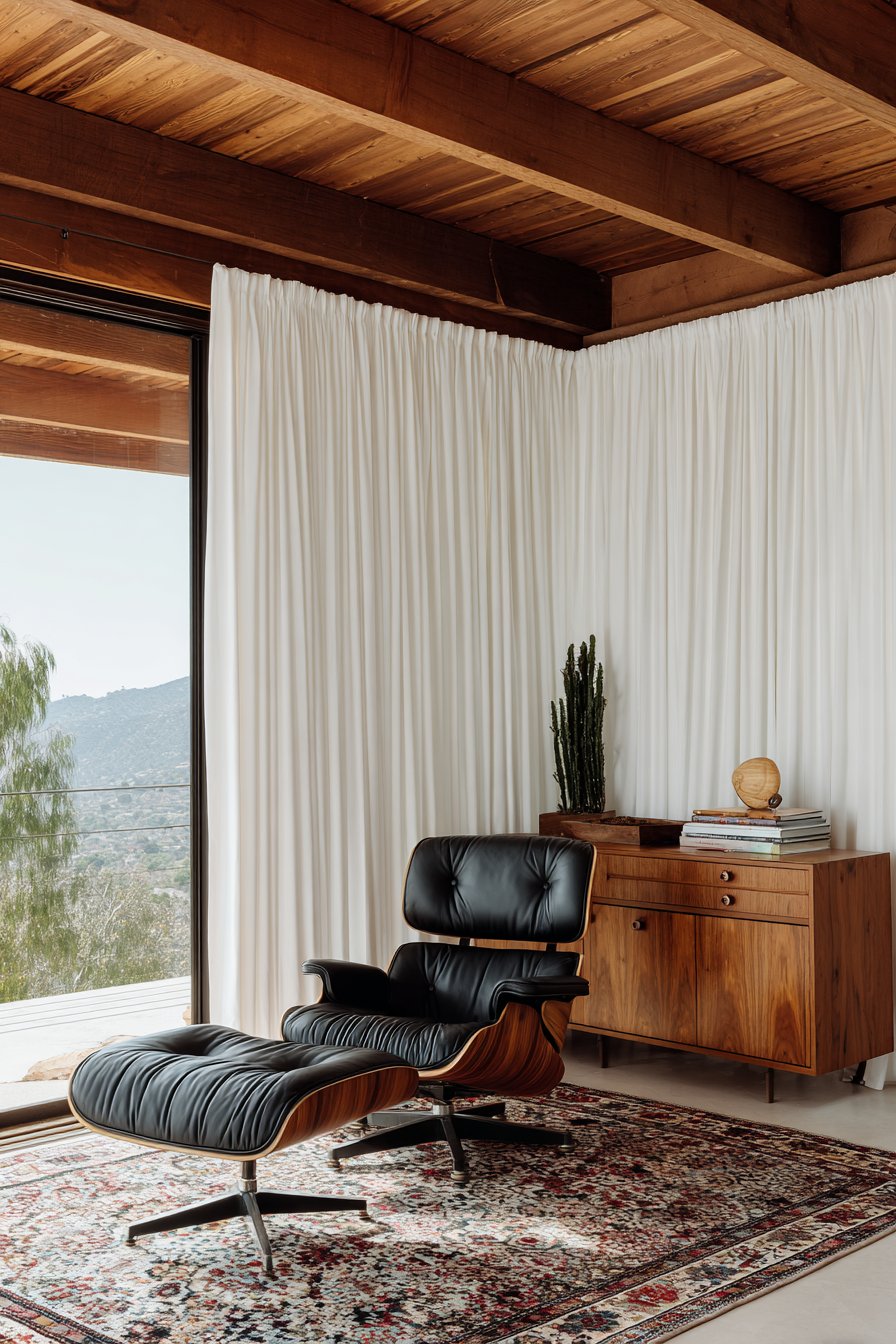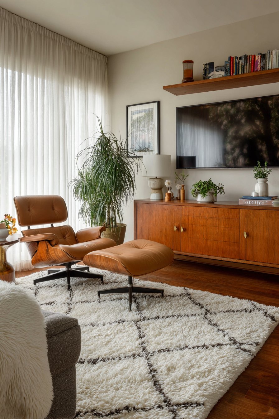 The living room showcases mid-century modern classics: an Eames lounge chair replica with its molded plywood and leather upholstery, a teak credenza with tapered legs and clean-lined drawers, and a geometric area rug in burnt orange and cream. These pieces represent the era’s marriage of form and function, where beautiful objects serve practical purposes without unnecessary ornament. The white pinch-pleat curtains support this philosophy, providing privacy and light control while maintaining visual simplicity. Their understated presence allows the sculptural quality of the furniture to remain focal, exactly as period-appropriate window treatments should.