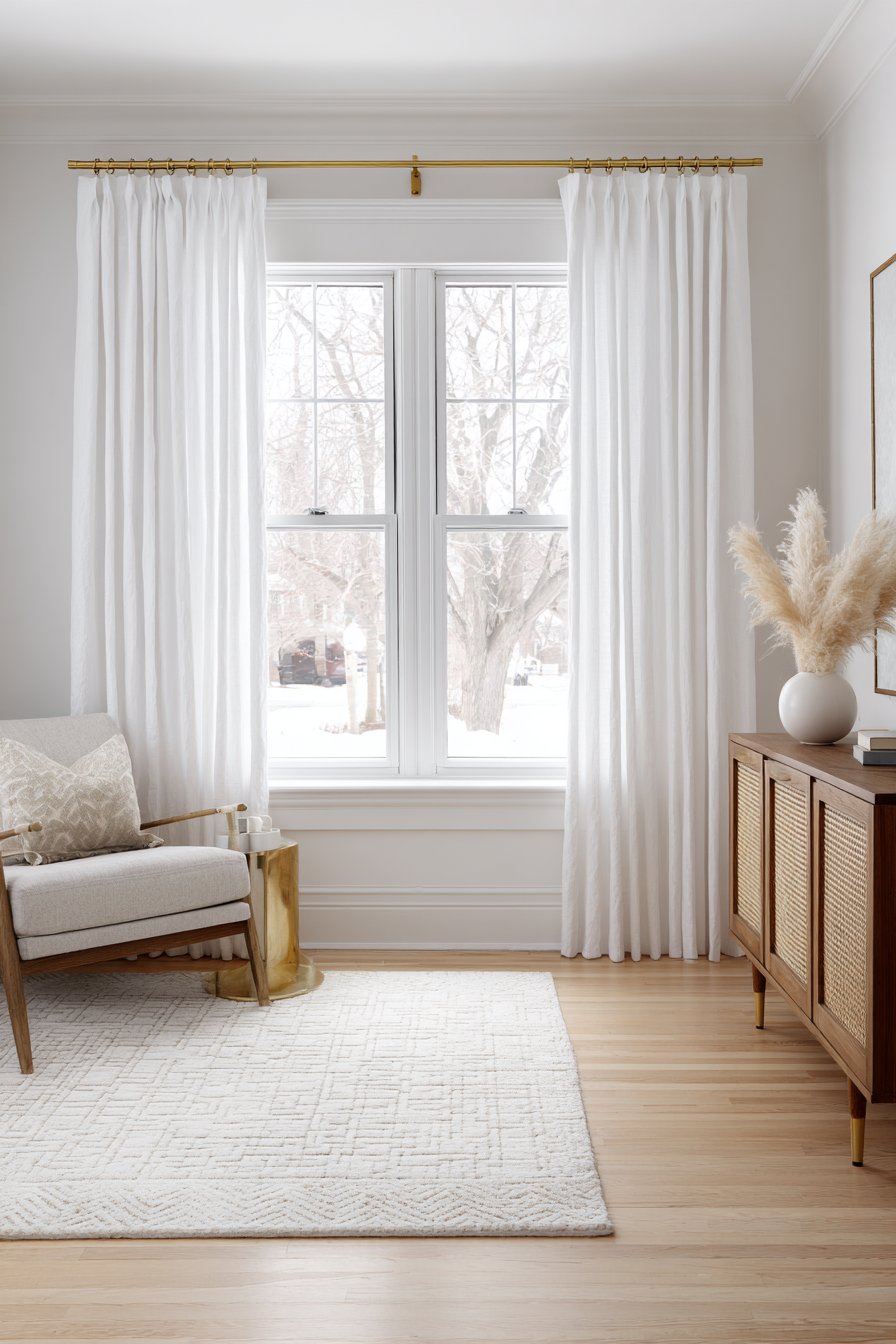 Mid-century modern design principles emphasize clean lines, organic forms, and functional beauty—all qualities embodied in simple white cotton pinch-pleat curtains on slim brass rods. These curtains reference the period’s preference for unadorned functionality, with pinch pleats providing structured elegance without excessive decoration. The brass rods contribute warm metallic accents characteristic of mid-century design, their slim profiles maintaining the streamlined aesthetic. Together, these elements create window treatments that enhance rather than distract from the iconic furniture pieces central to this enduring style.