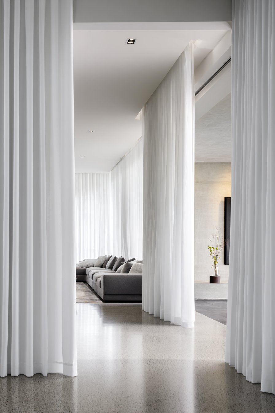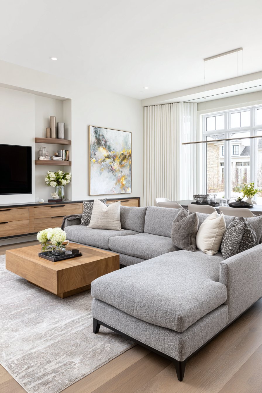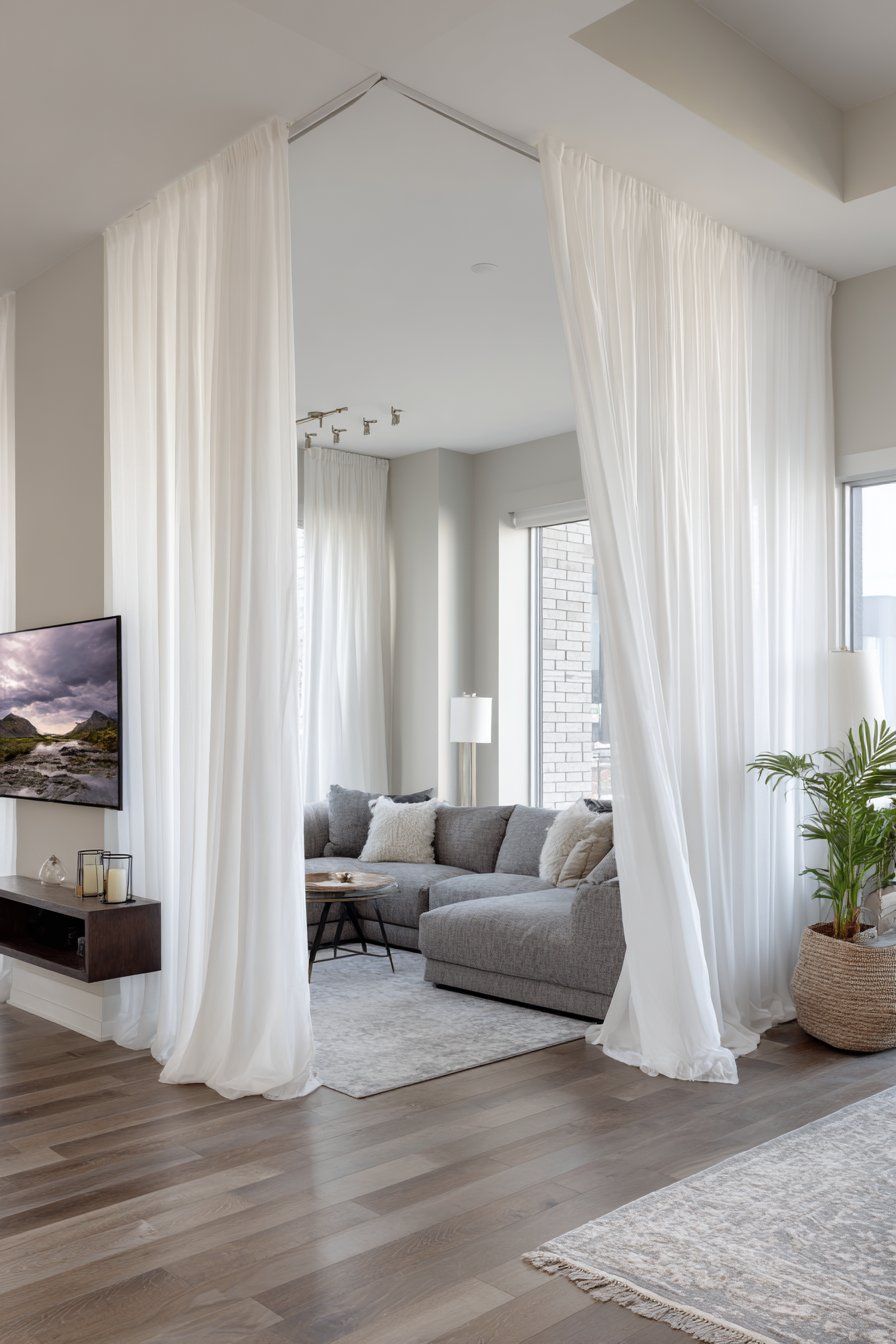 The contemporary open-concept space demonstrates this flexible approach with a grey sectional defining the living area, while a dining table visible beyond establishes the separate dining zone. A floating media console mounted to the wall maintains the open feeling while providing entertainment storage. Polished wood floors flow seamlessly throughout, reinforcing spatial continuity. When the white linen curtains draw closed along their ceiling tracks, they create instant privacy for either zone—useful when entertaining in one area while another household member works or relaxes in the other, or when visual separation enhances activities.