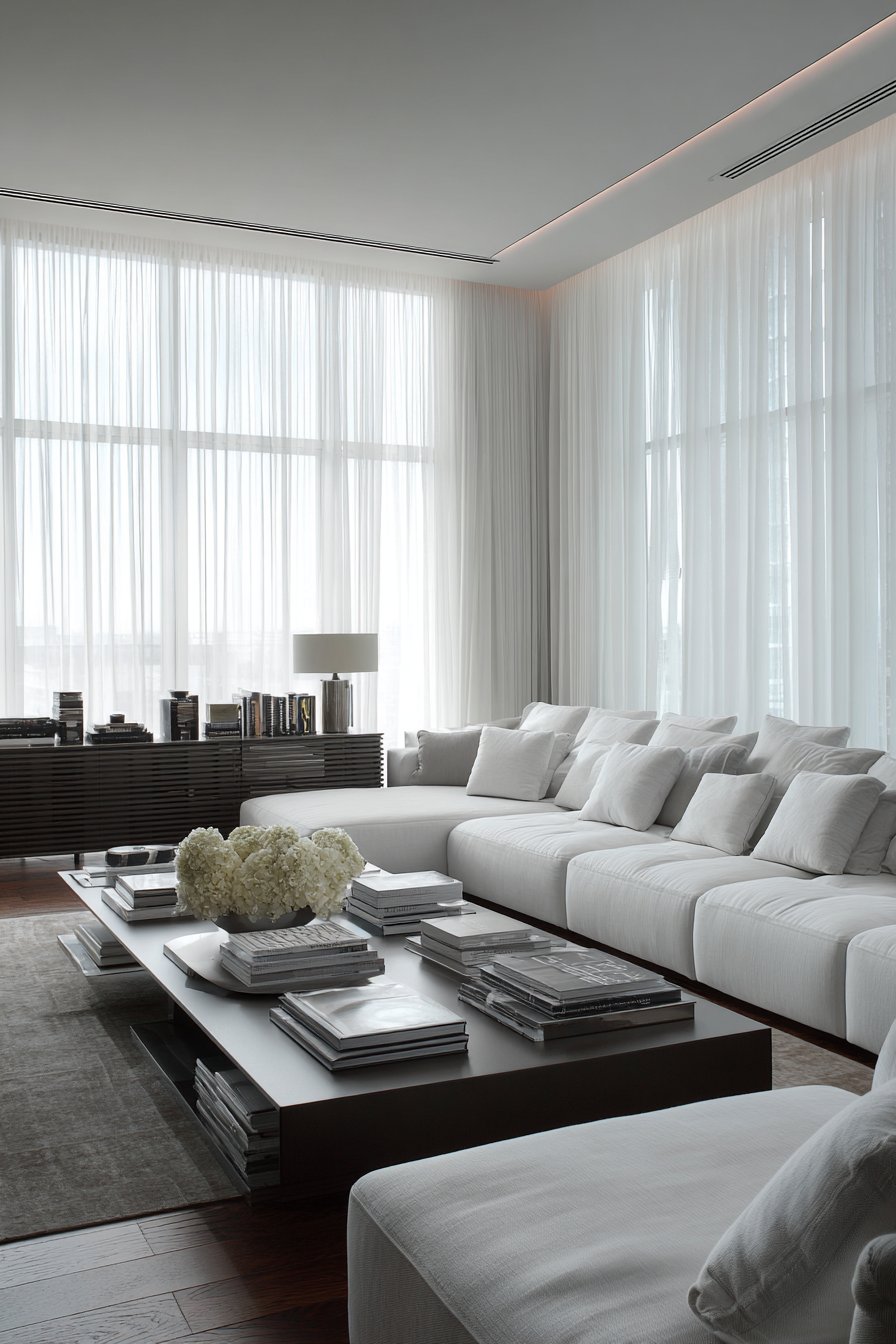 Golden hour sunlight streaming through these layered white curtains creates one of the most magical effects in interior design. The combination of sheer and opaque fabrics creates dimensional shadows and highlights, with the heavier outer drapes casting deeper shadows along their folds while the inner sheers glow luminously. This interplay of light and fabric transforms throughout the day, ensuring the living room never appears static but instead evolves with natural light patterns. The investment in dual treatments pays dividends not only in functionality but in the ever-changing visual interest they provide.
