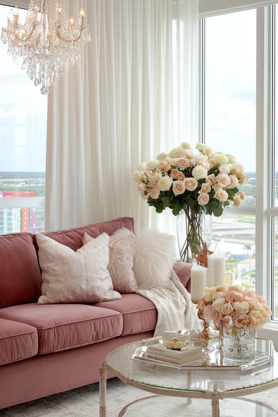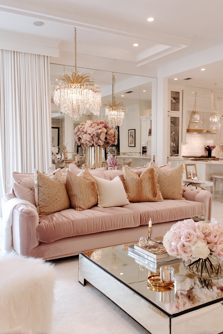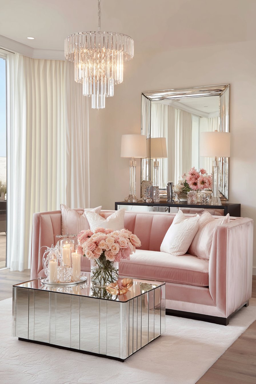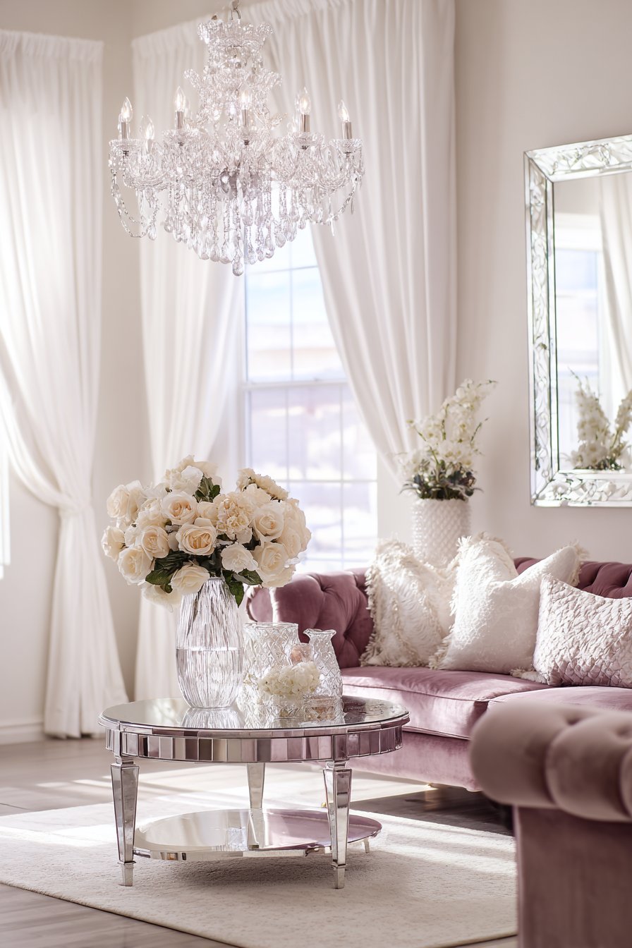 The sophisticated living room pairs these velvet curtains with equally sumptuous elements: a blush pink velvet sofa that introduces soft color while maintaining textural theme, a mirrored coffee table that multiplies light and creates visual intrigue, and crystal accents throughout that catch and refract illumination. A statement chandelier overhead serves as jewelry for the room, its prismatic crystals creating rainbow effects that dance across the white velvet curtains. Gold or brass accents in frames, lamp bases, and decorative objects introduce warm metallic notes that enhance the glamorous atmosphere without appearing gaudy.