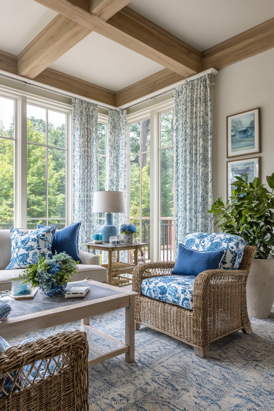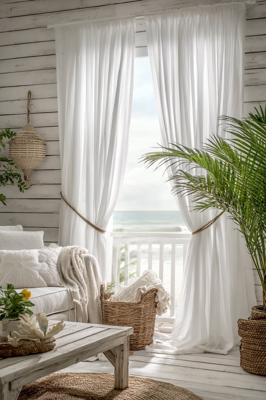 Coastal design comes alive through flowing white cotton curtains casually tied back with natural rope holdbacks, immediately evoking seaside living and breezy relaxation. These curtains embody the effortless style characteristic of beach houses, where formality gives way to comfort and connection with the outdoors. The rope holdbacks serve both functional and decorative purposes, securing the curtains while introducing a nautical detail that reinforces the coastal theme. When released, the curtains billow gently in the breeze, creating movement and life within the space.