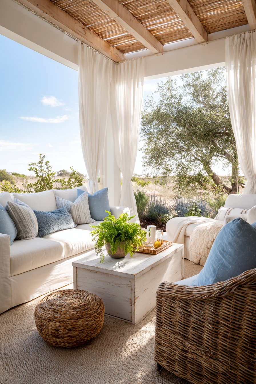 - Embrace the indoor-outdoor connection by positioning furniture to enjoy breezes flowing through white curtains