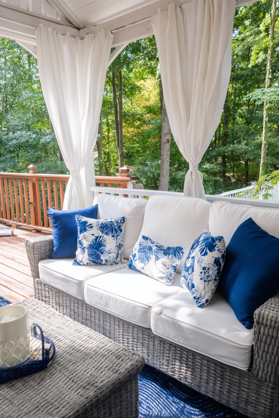 The screened porch living area embraces all-weather furnishings that don’t sacrifice comfort or style. Wicker furniture with plump cushions in nautical blue creates comfortable seating arrangements that withstand humidity and temperature changes. Side tables of weather-resistant materials provide surface area for drinks and books, while outdoor rugs define zones and add pattern. Potted plants and hanging baskets introduce living greenery that connects the space to the surrounding landscape. The white outdoor curtains tie everything together, their clean color and flowing form softening the structure while providing flexible climate control as the day progresses and weather changes.