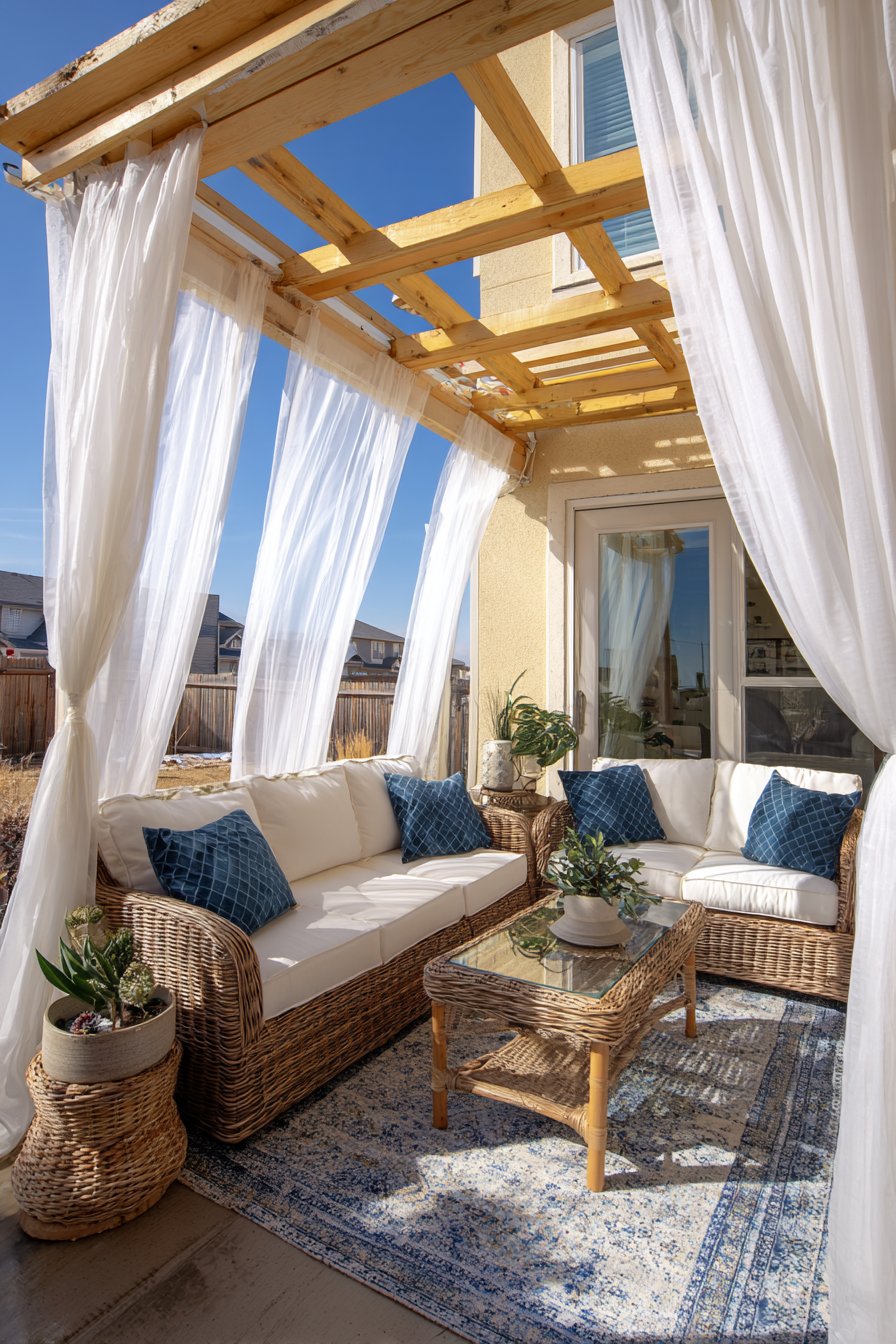 Natural afternoon light filtering through white outdoor curtains creates the perfect ambiance for outdoor living. The fabric diffuses harsh sun while maintaining brightness, creating comfortable conditions for reading, conversation, or dining. As evening approaches, the curtains can draw closed for privacy and wind protection, transforming the open porch into a more intimate, enclosed feeling space. This flexibility makes outdoor rooms truly functional extensions of interior living areas rather than spaces used only in perfect weather conditions. The white color keeps the outdoor room feeling fresh and bright while showing less dirt than darker fabrics might reveal.