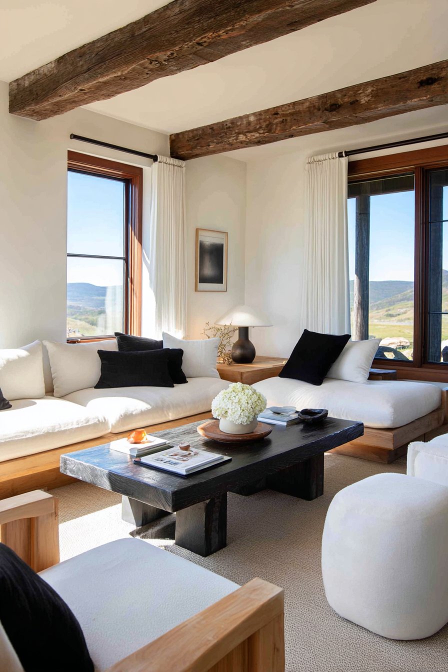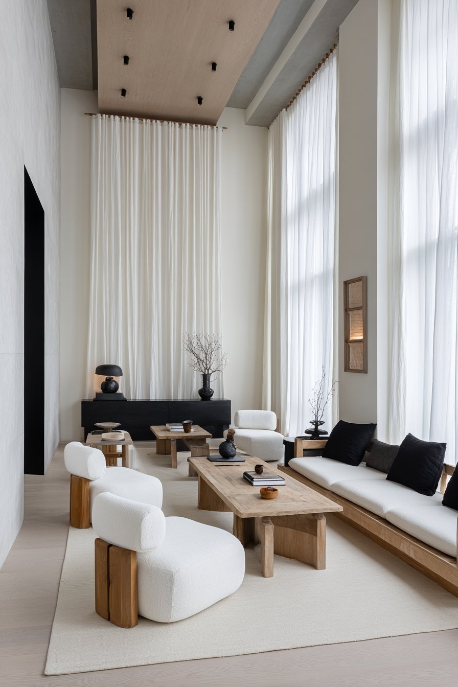 The serene living room embodies Japandi principles through low-profile furniture that emphasizes horizontal lines and connection to earth. Floor cushions or low sofas maintain sight lines and create the grounded feeling characteristic of Japanese interiors. Natural materials dominate—a low wooden coffee table with simple joinery details, bamboo blinds layered behind the white curtains for light control, and stone or ceramic accessories in organic forms. A neutral color palette with black accents provides the limited palette both Japanese and Scandinavian traditions favor, creating calm through restraint rather than abundance.