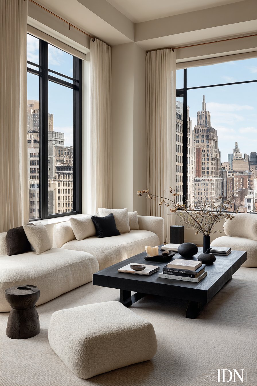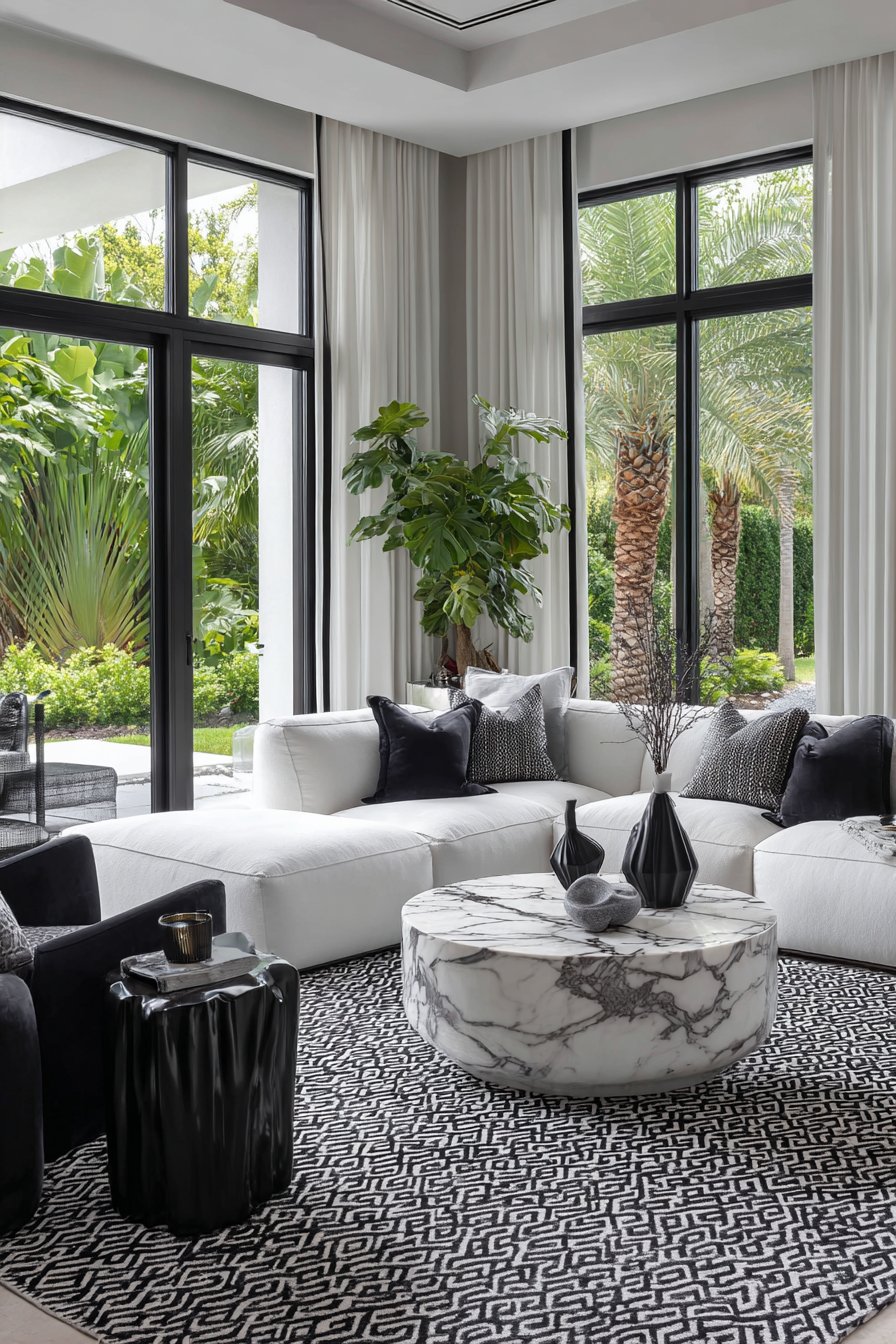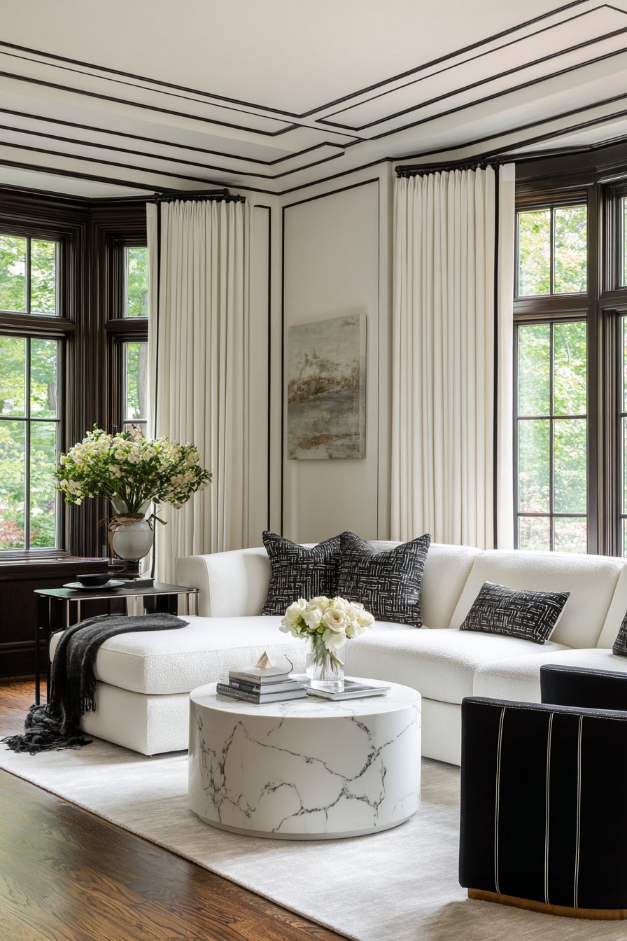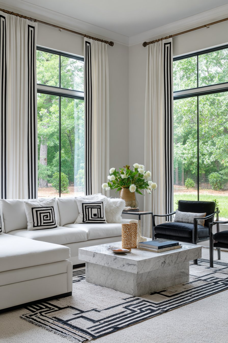The monochromatic living room provides the perfect canvas for these graphic curtains. A white sectional sofa creates generous seating while maintaining the light, airy feeling that monochromatic schemes can achieve. Black accent chairs introduce necessary contrast and visual weight, preventing the space from floating away in all-white ethereality. A white marble coffee table with black veining bridges the two colors, its natural stone patterns echoing the geometric curtain details. Accessories in black, white, and occasional metallic accents maintain the limited palette while adding variety through form and texture rather than color.