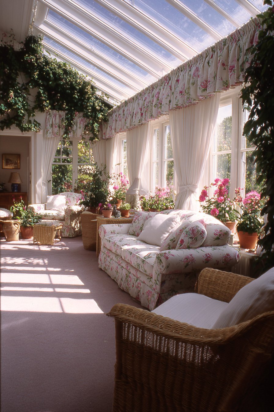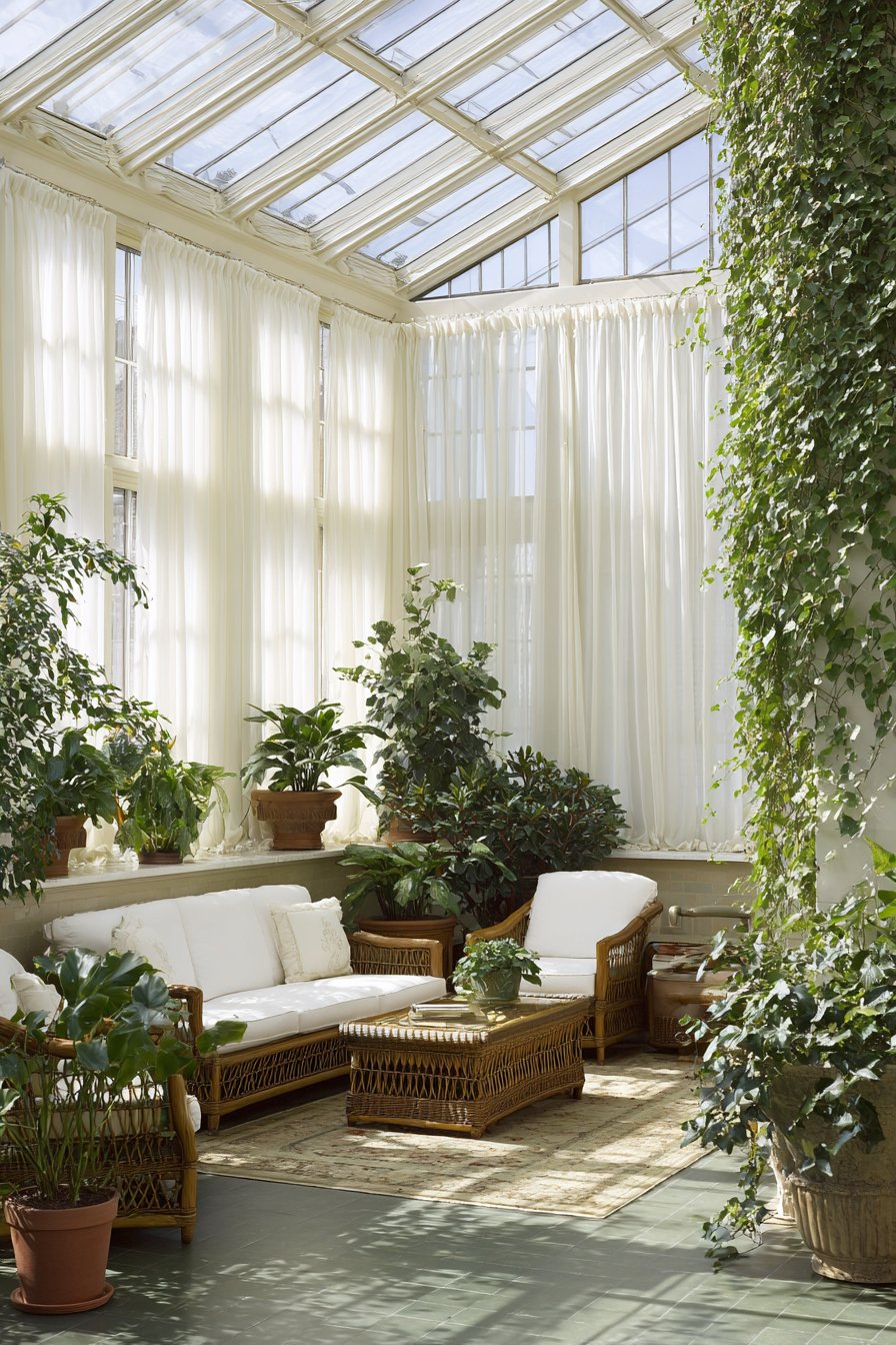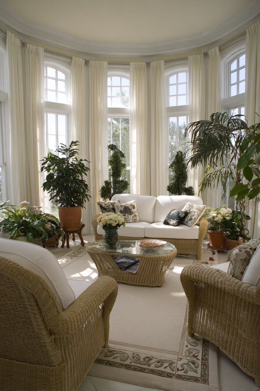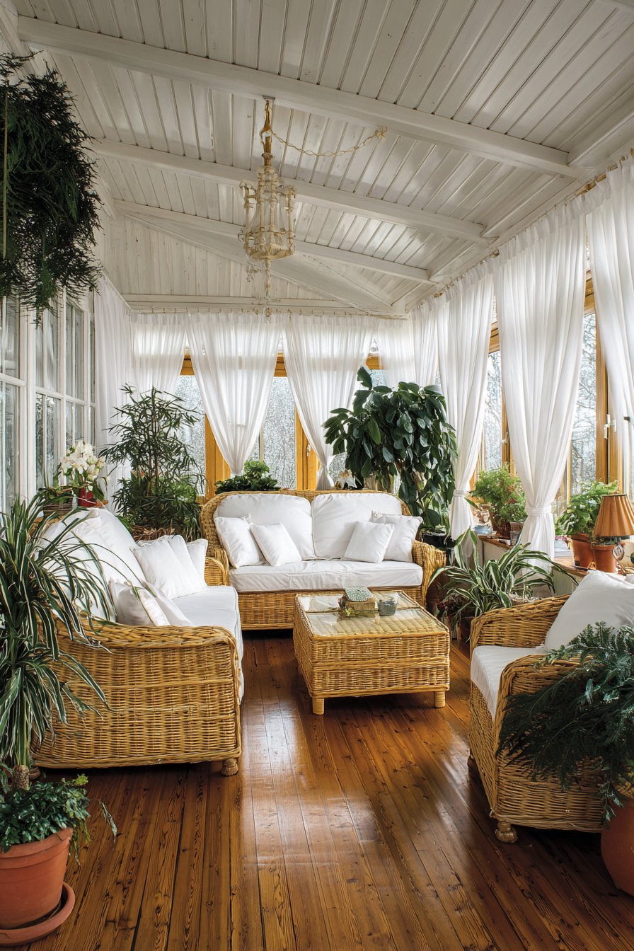 The light-filled sunroom embraces its connection to outdoors through abundant greenery and natural materials. Wicker furniture with plump white cushions provides comfortable seating that suits the indoor-outdoor nature of the space. Terra cotta pots in various sizes house thriving plants—ferns, palms, flowering specimens—creating an indoor garden atmosphere. The floor, whether tile or sealed concrete, withstands moisture from watering and humidity from plants. Against this abundance of texture and organic forms, the white tab-top curtains provide visual rest, their clean color and simple style preventing overstimulation despite the busy plant life.