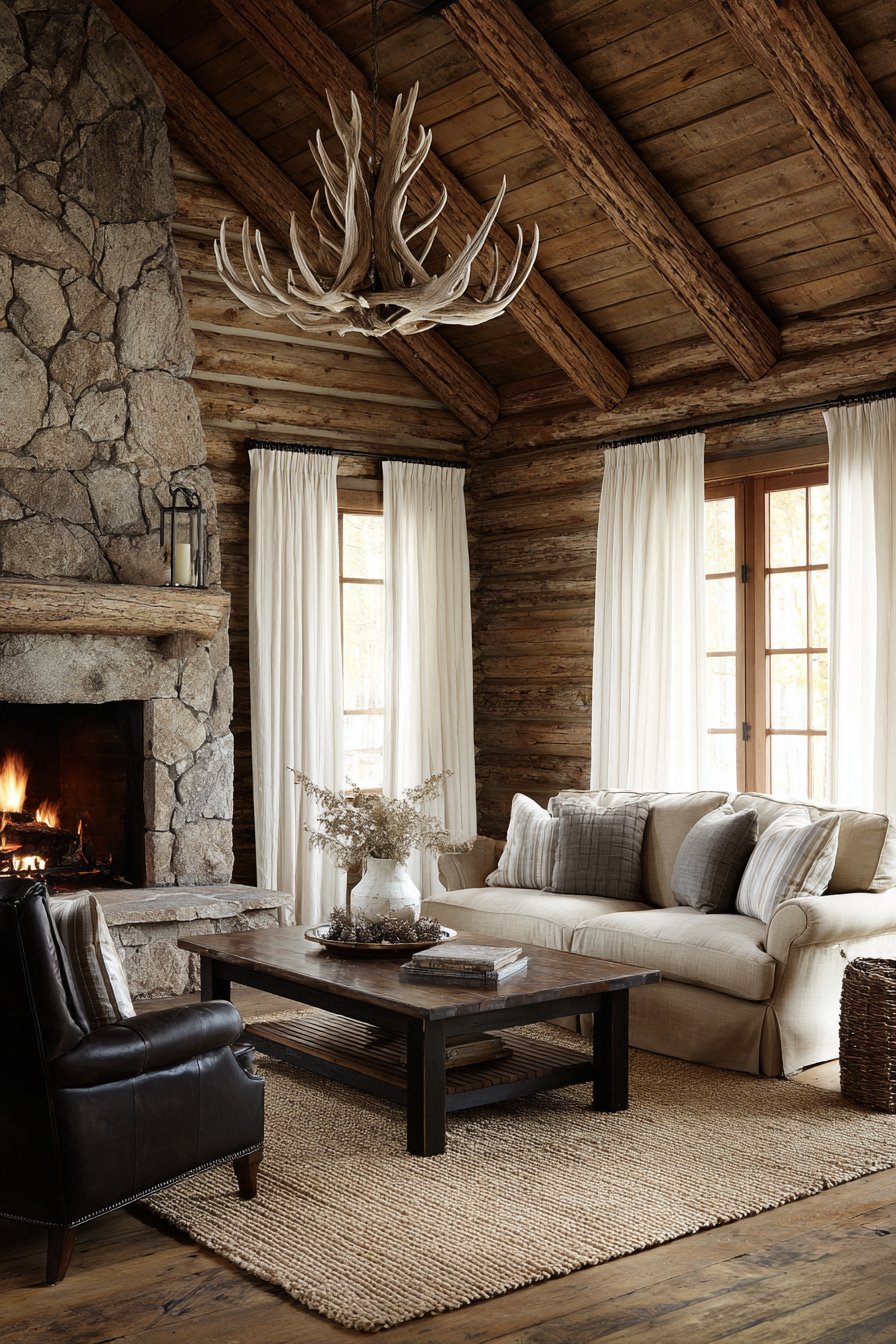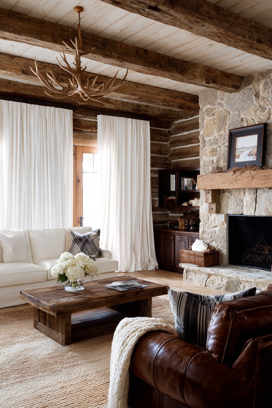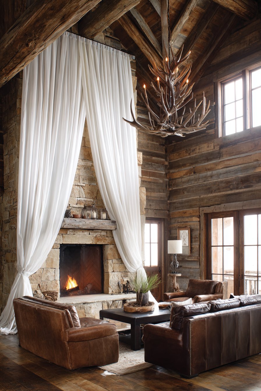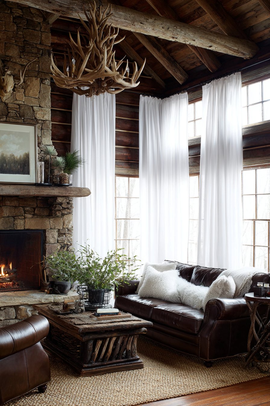- Balance white curtains with dark wood, leather, and stone elements for authentic lodge aesthetic