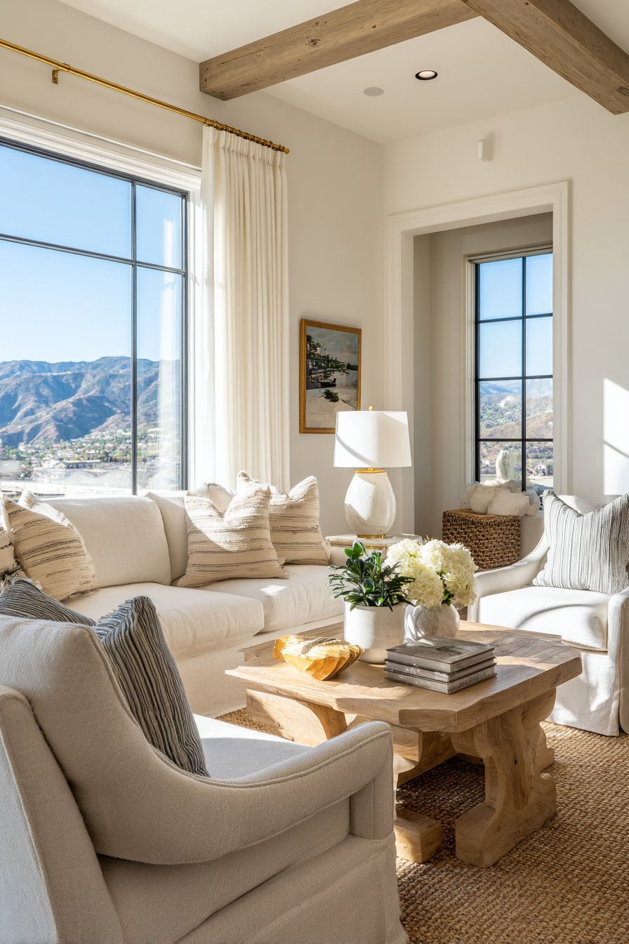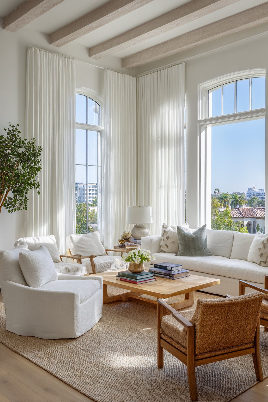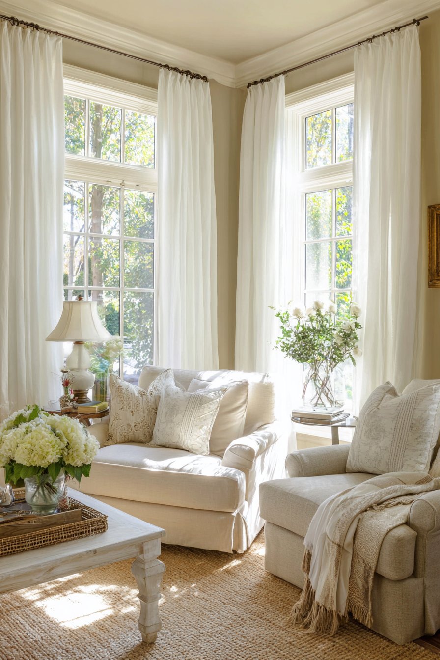 The elegant living room that houses these layered treatments features a carefully curated neutral palette with beige upholstered furniture that complements rather than competes with the window treatments. Natural jute rugs ground the space with organic texture, while whitewashed wood floors reflect light upward, amplifying the brightness introduced by the white curtains. This combination of materials creates subtle tonal variations that prevent the monochromatic scheme from feeling monotonous. Each element contributes its own texture—the smooth cotton drapes, the gauzy voile sheers, the nubby jute, and the grainy wood—building a rich sensory experience.