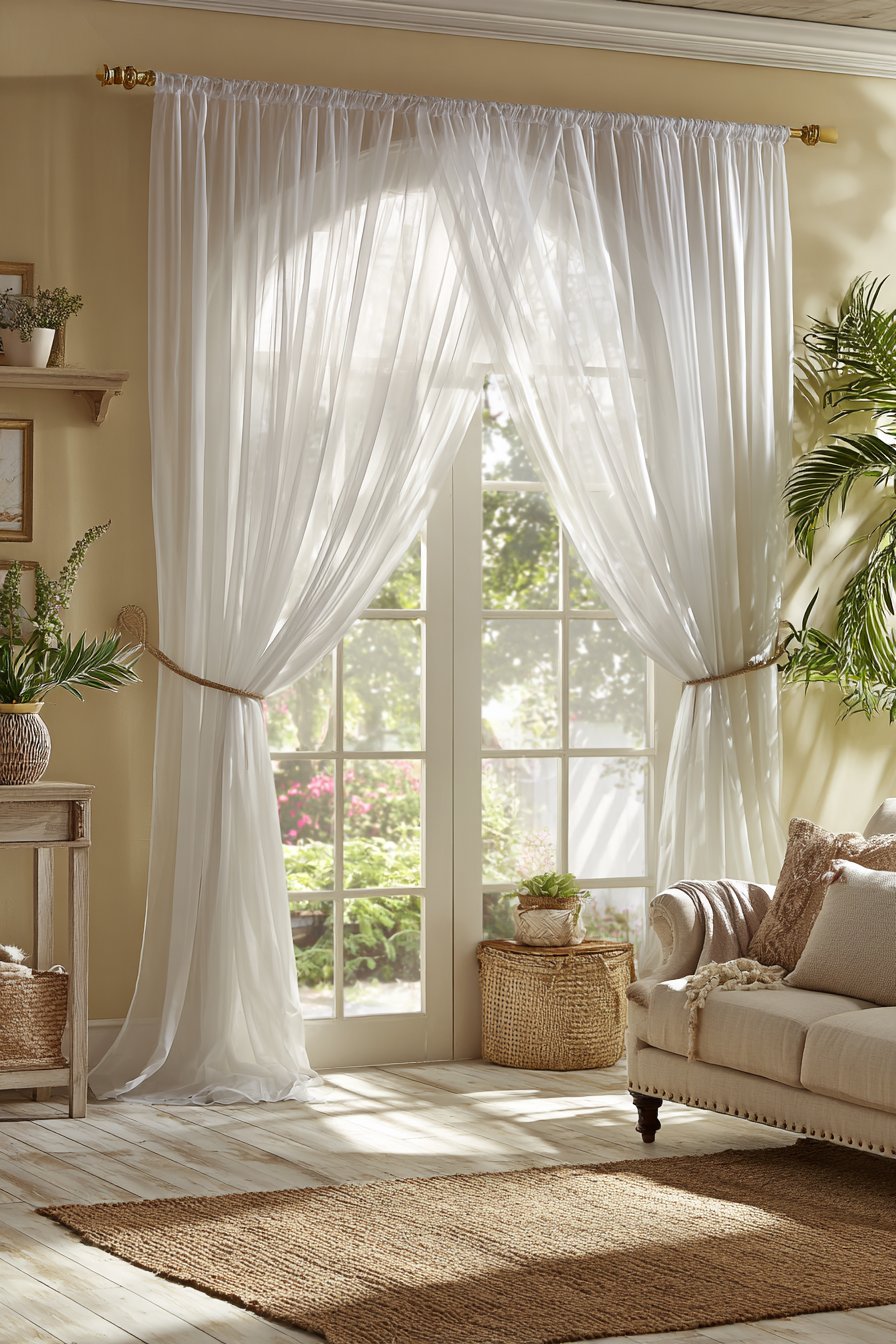 - Combine white curtains with reclaimed or weathered wood elements to establish the farmhouse aesthetic