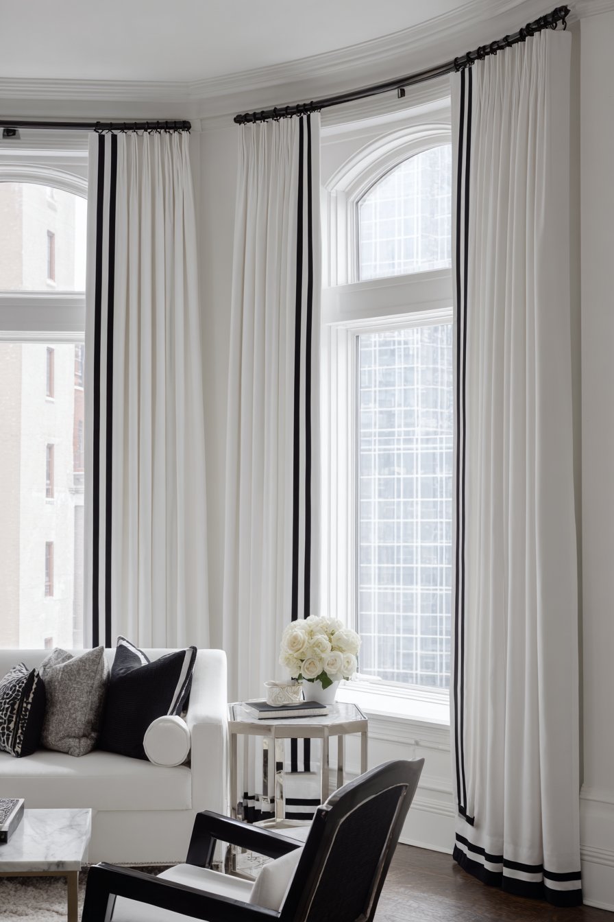 Bold contemporary design welcomes graphic elements, and white curtains with geometric black trim create striking architectural interest. These custom-detailed curtains transform from simple window coverings into statement pieces through the addition of black ribbon or fabric strips applied in clean geometric patterns—perhaps a single wide stripe along the leading edge, Greek key patterns along the hem, or modern color-blocking effects. The high-contrast black-and-white combination reads as sophisticated and modern, immediately signaling deliberate design choices rather than default window treatments.