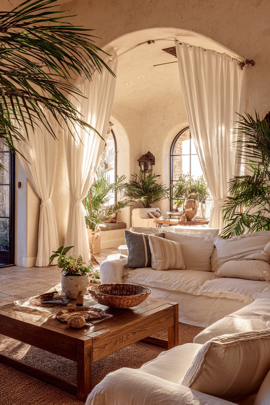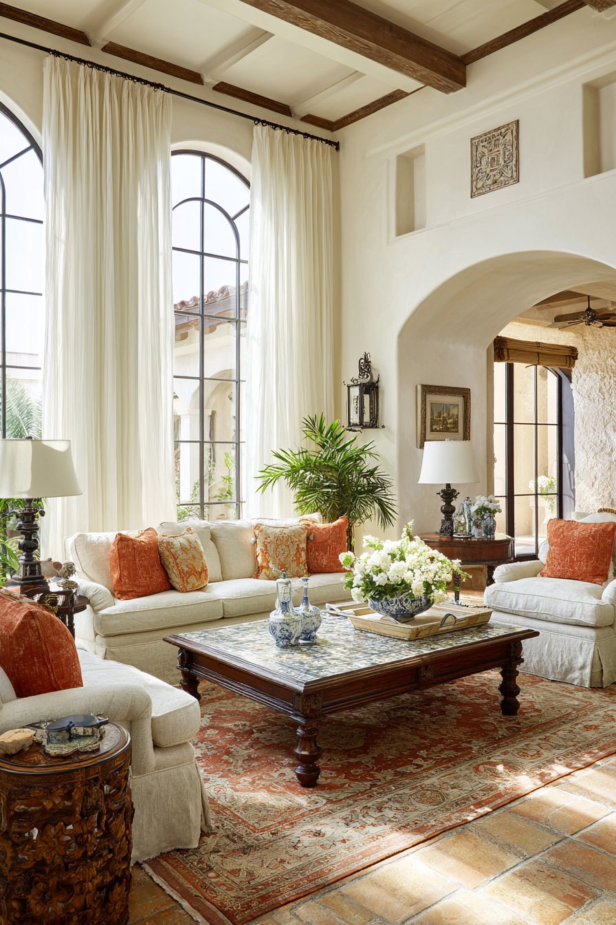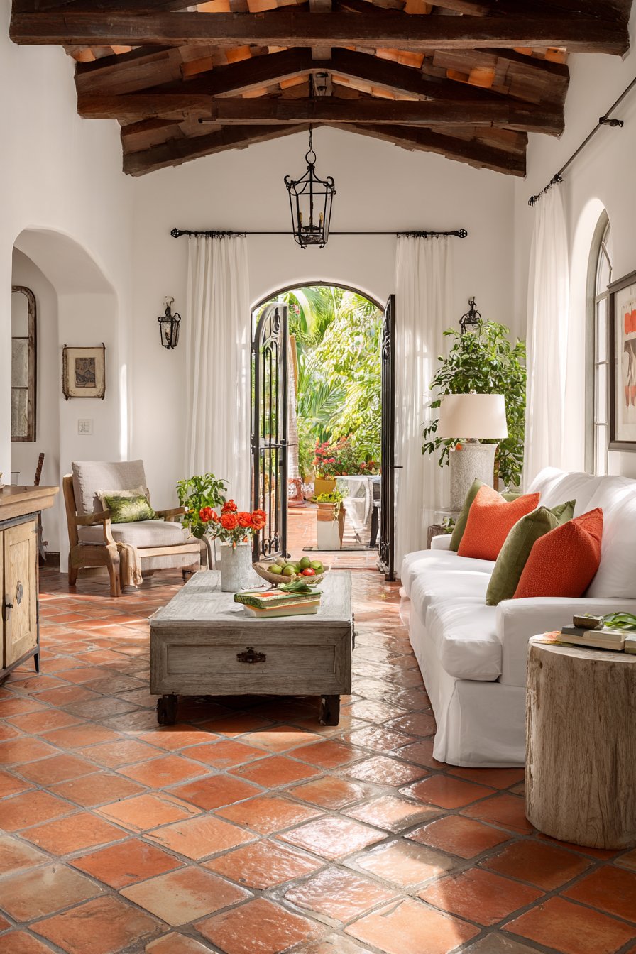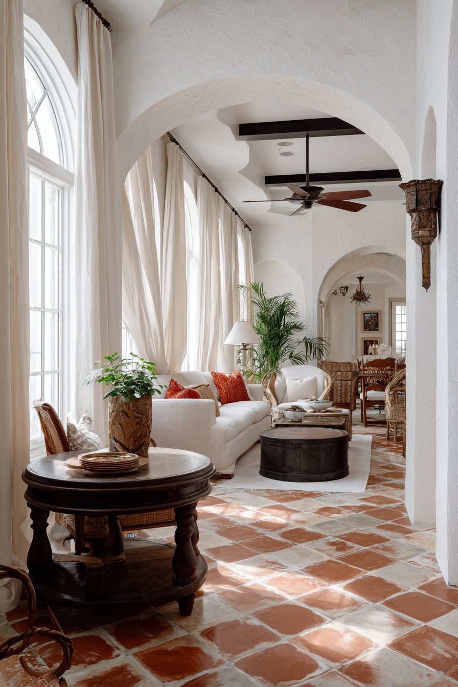 The Mediterranean-inspired living room embraces the region’s traditional materials and colors. Terracotta tile floors in warm orange-red tones ground the space with earthy permanence, their cool surface providing relief during hot summers. Wrought iron accents—perhaps in chandelier, candle holders, or furniture details—introduce the hand-forged metalwork characteristic of Spanish and Italian design. Whitewashed walls reflect light and heat while creating a neutral backdrop for vibrant tile work, colorful ceramics, and rich wood tones. The lightweight white gauze curtains soften these strong architectural elements, their ethereal quality providing counterpoint to solid stone and iron.