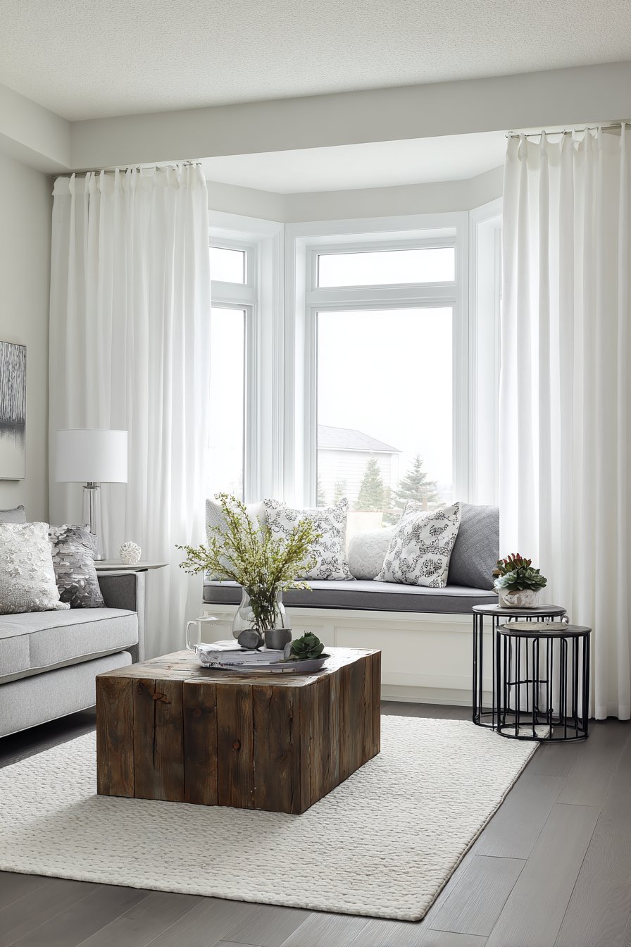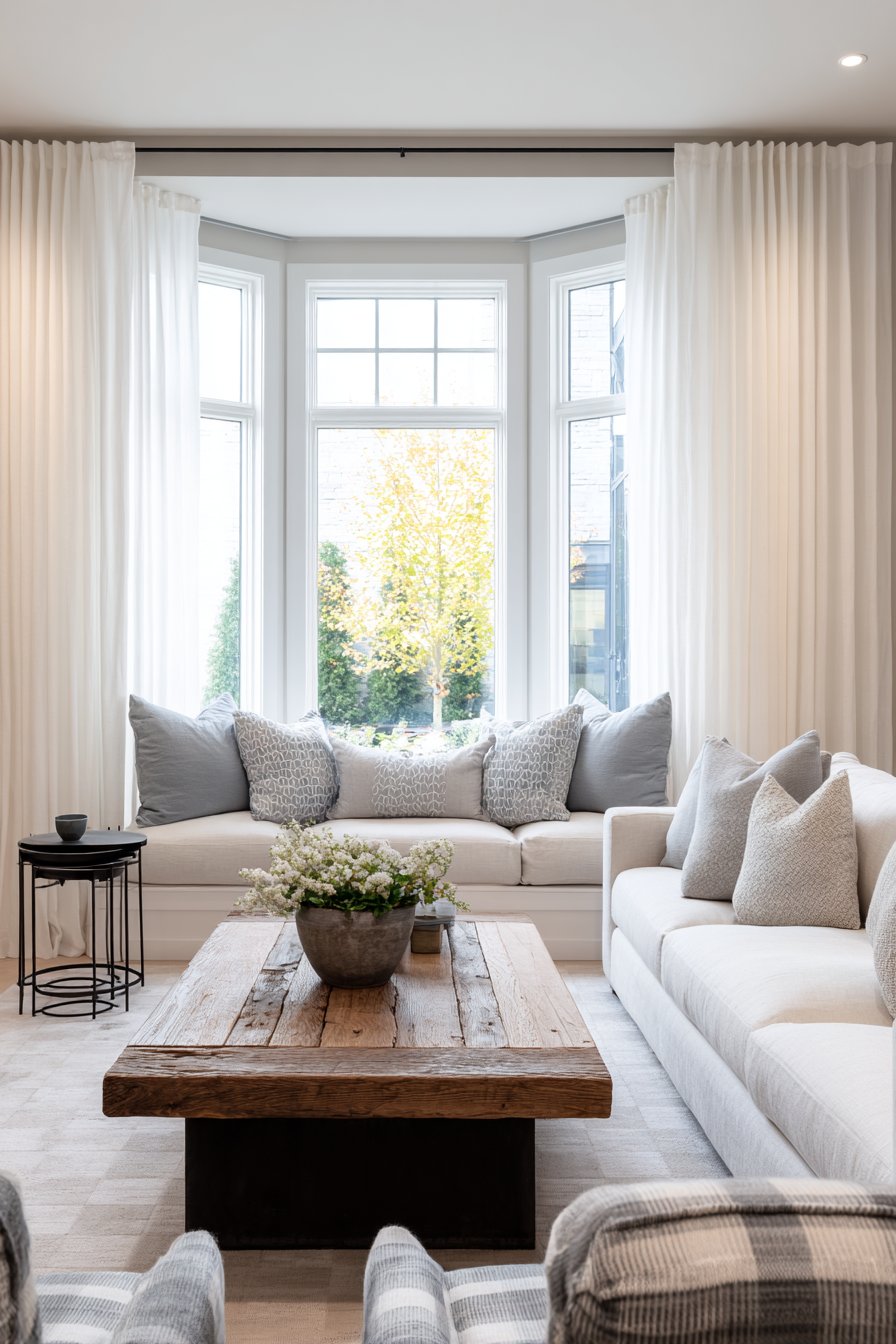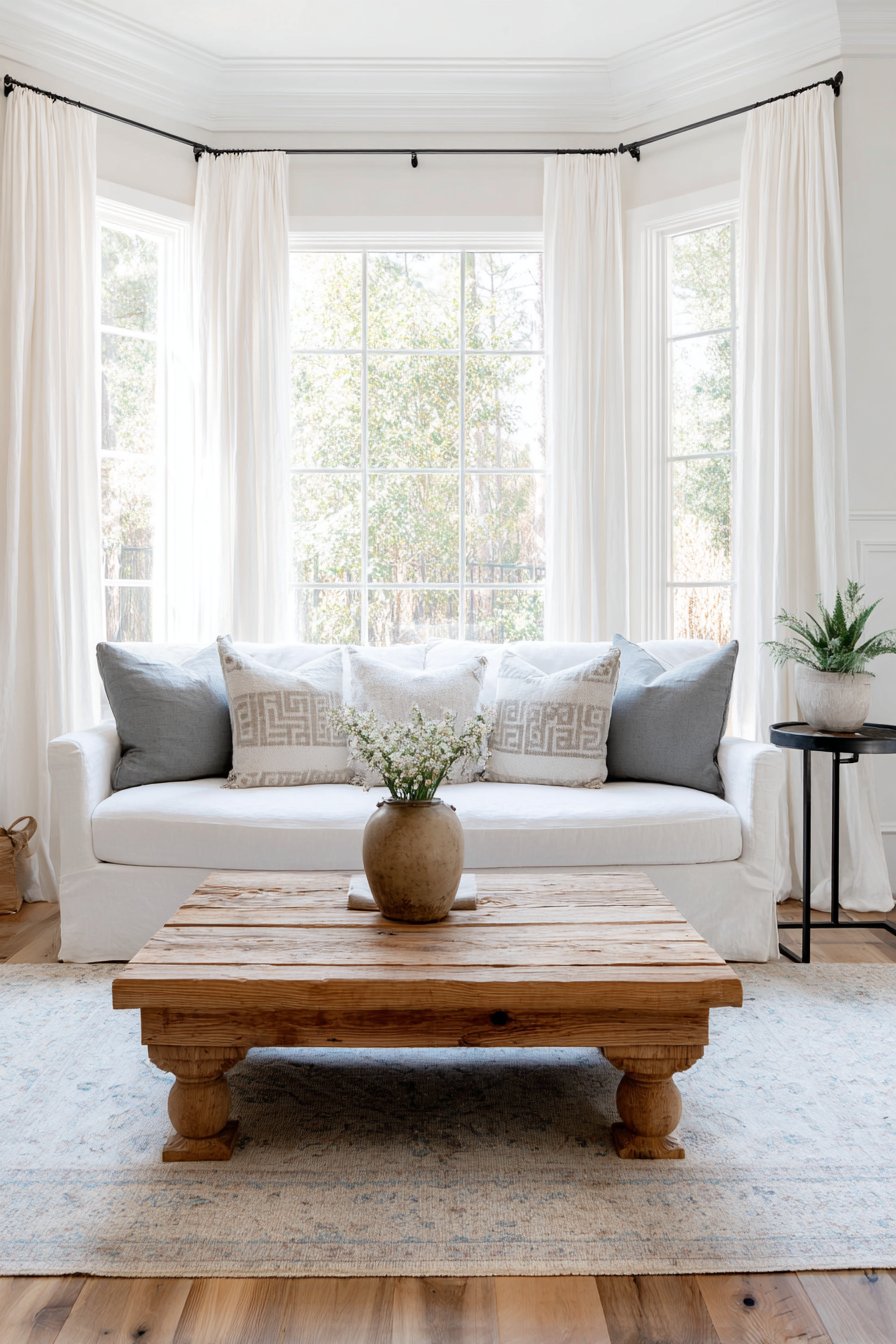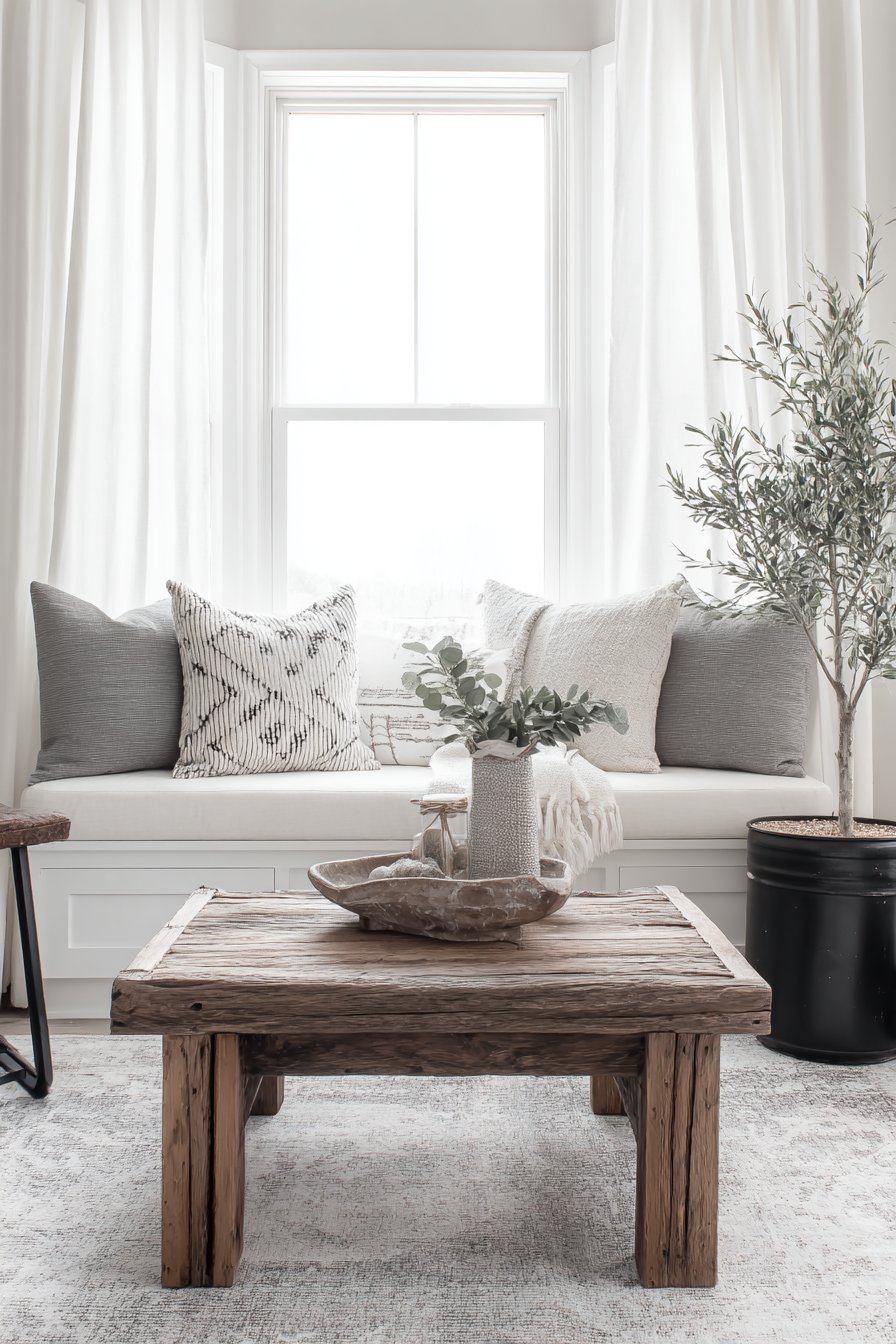 The curtains flank a charming bay window seat fitted with plush grey cushions and an assortment of patterned pillows that introduce subtle color and visual interest. This window seat becomes a destination within the room, a cozy retreat for reading, conversation, or simply gazing outdoors while wrapped in the soft embrace of the white curtains. Below, a reclaimed wood coffee table bears the marks of its previous life—nail holes, weathering, and patina—while an industrial metal side table provides contrast with its clean lines and darker finish. These contrasting elements create the eclectic mix that makes farmhouse interiors feel collected over time rather than decorated all at once.