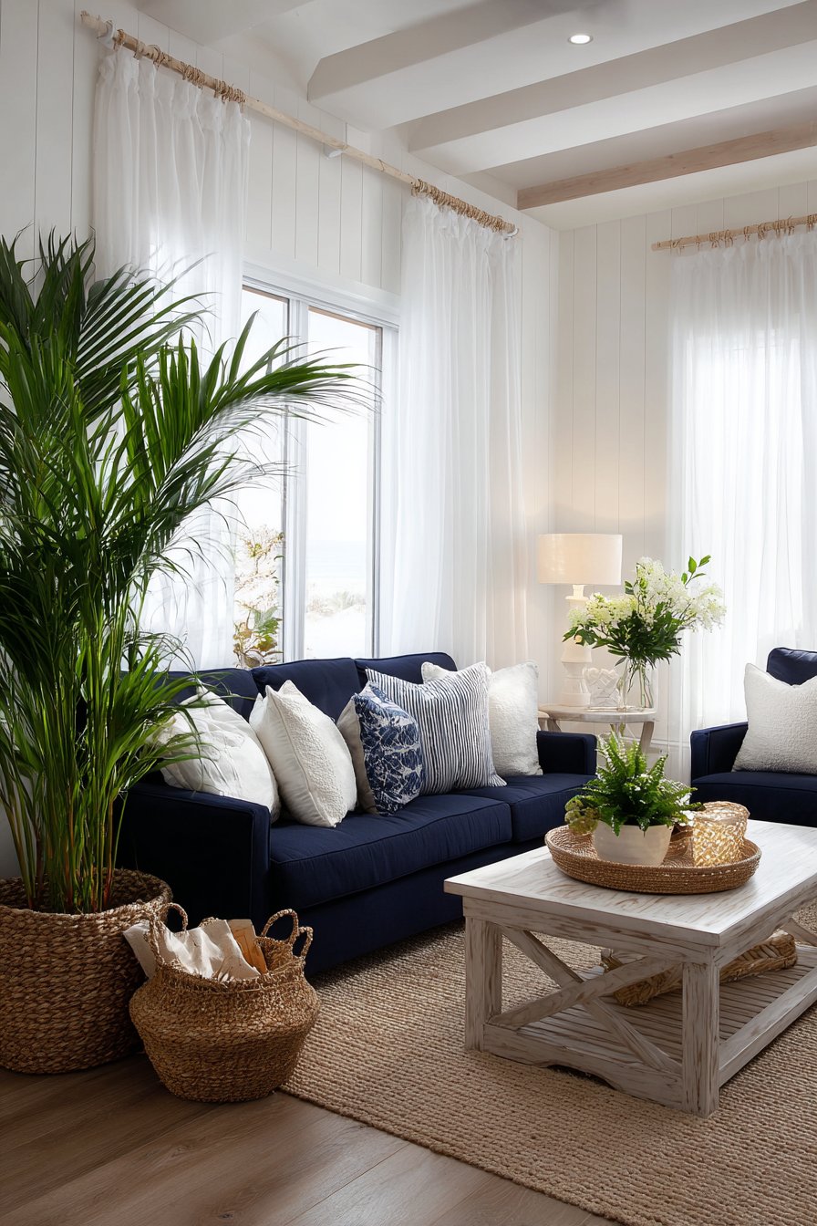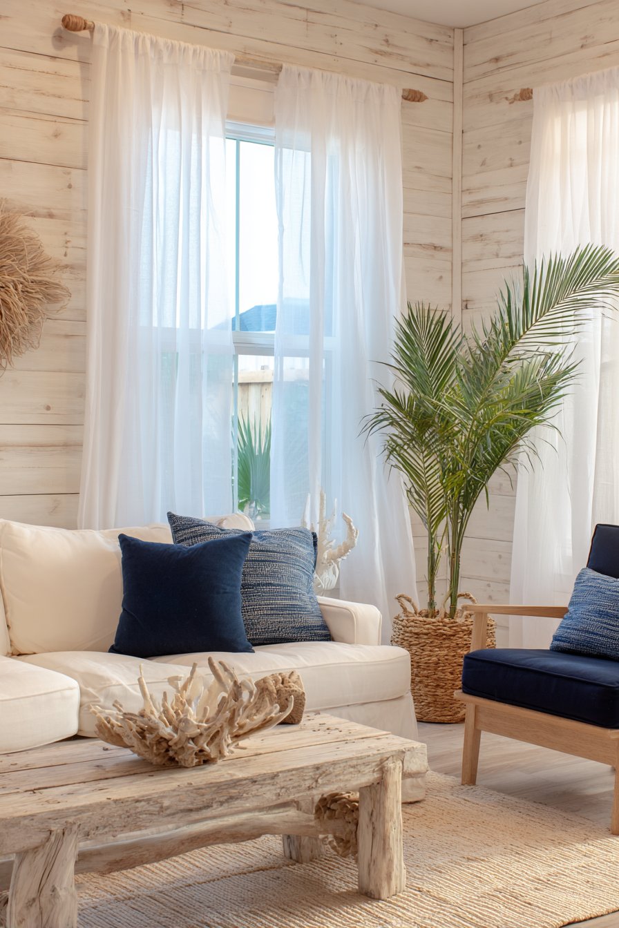 - Add natural elements like driftwood, seagrass, and potted palms to complete the coastal atmosphere