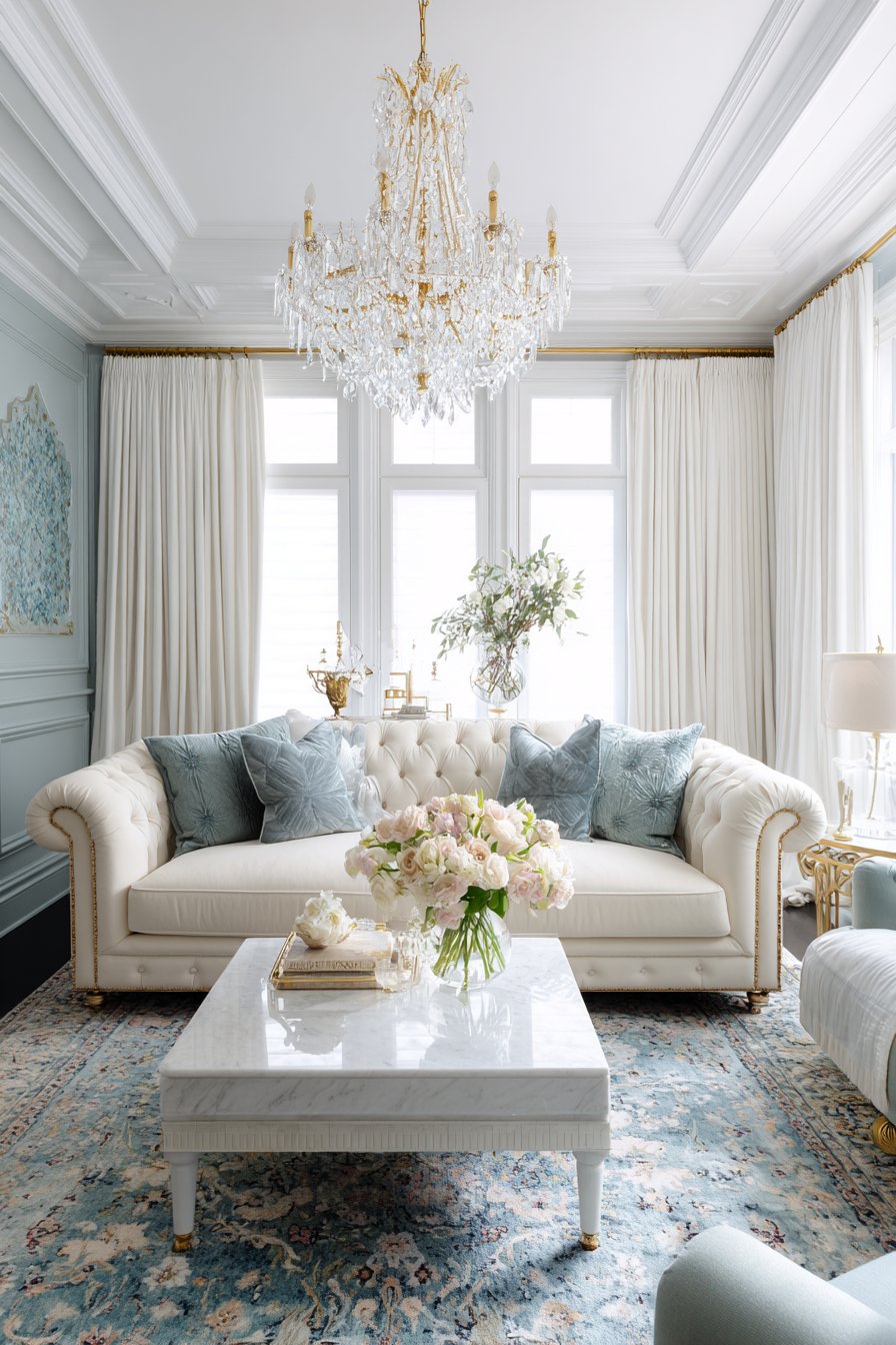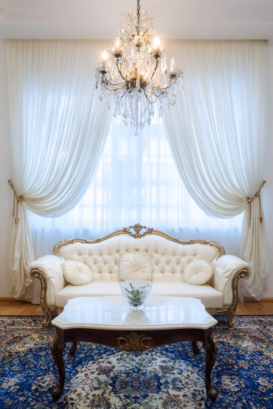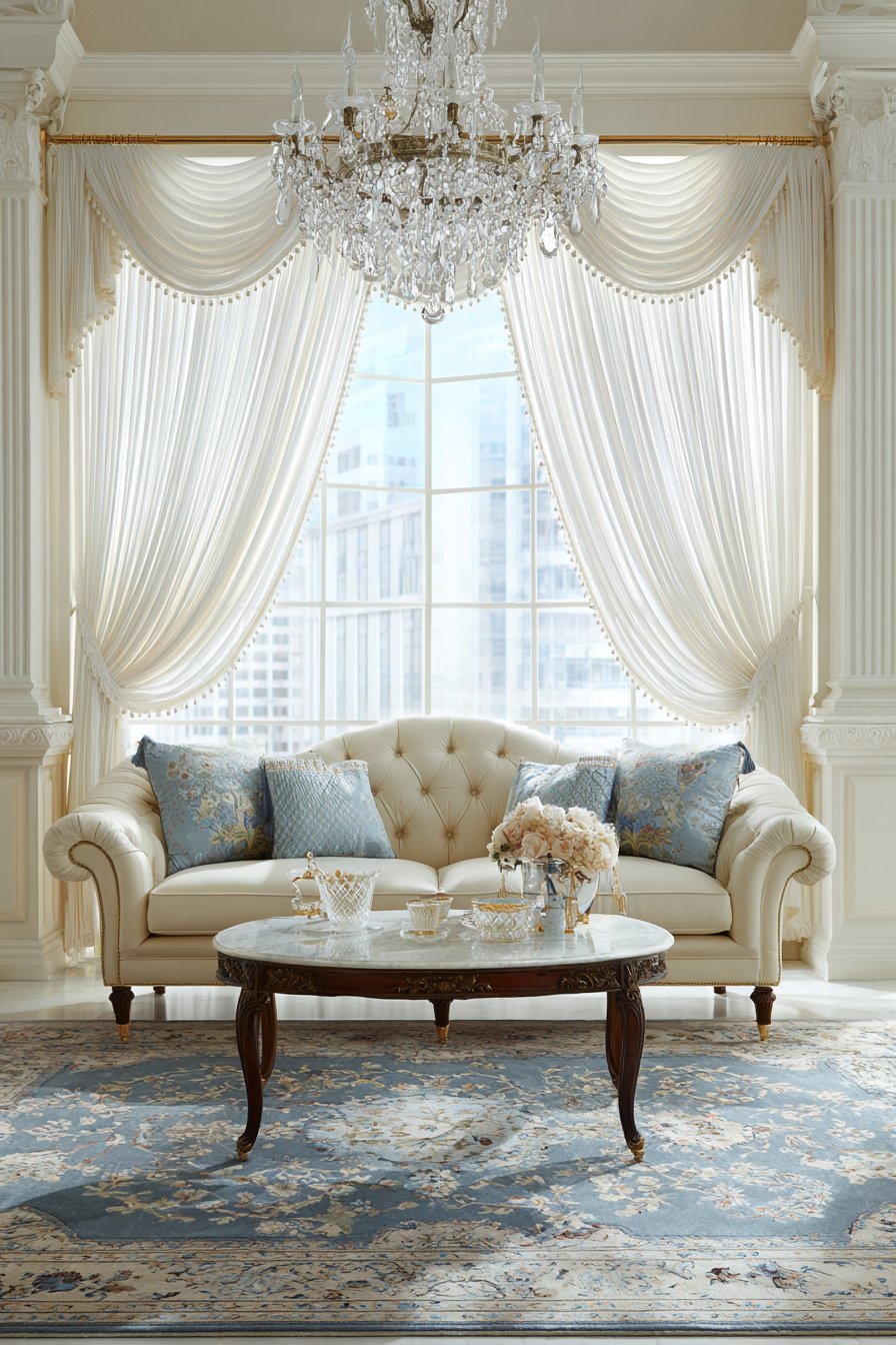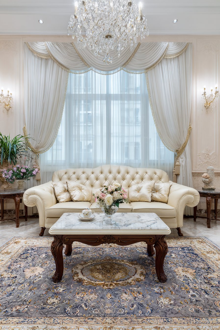 The traditional living room housing these elegant curtains features furnishings befitting their formality. A tufted cream sofa upholstered in luxurious fabric provides comfortable yet refined seating, its button tufting and rolled arms speaking to classic design principles. A marble-top coffee table adds another layer of luxury, its cool stone surface and brass legs coordinating with the curtain hardware. Beneath, a Persian rug in soft blues and ivories introduces pattern and warmth while maintaining the room’s elegant color palette. Above, a crystal chandelier catches light from the windows, creating prismatic effects that dance across the white curtains.