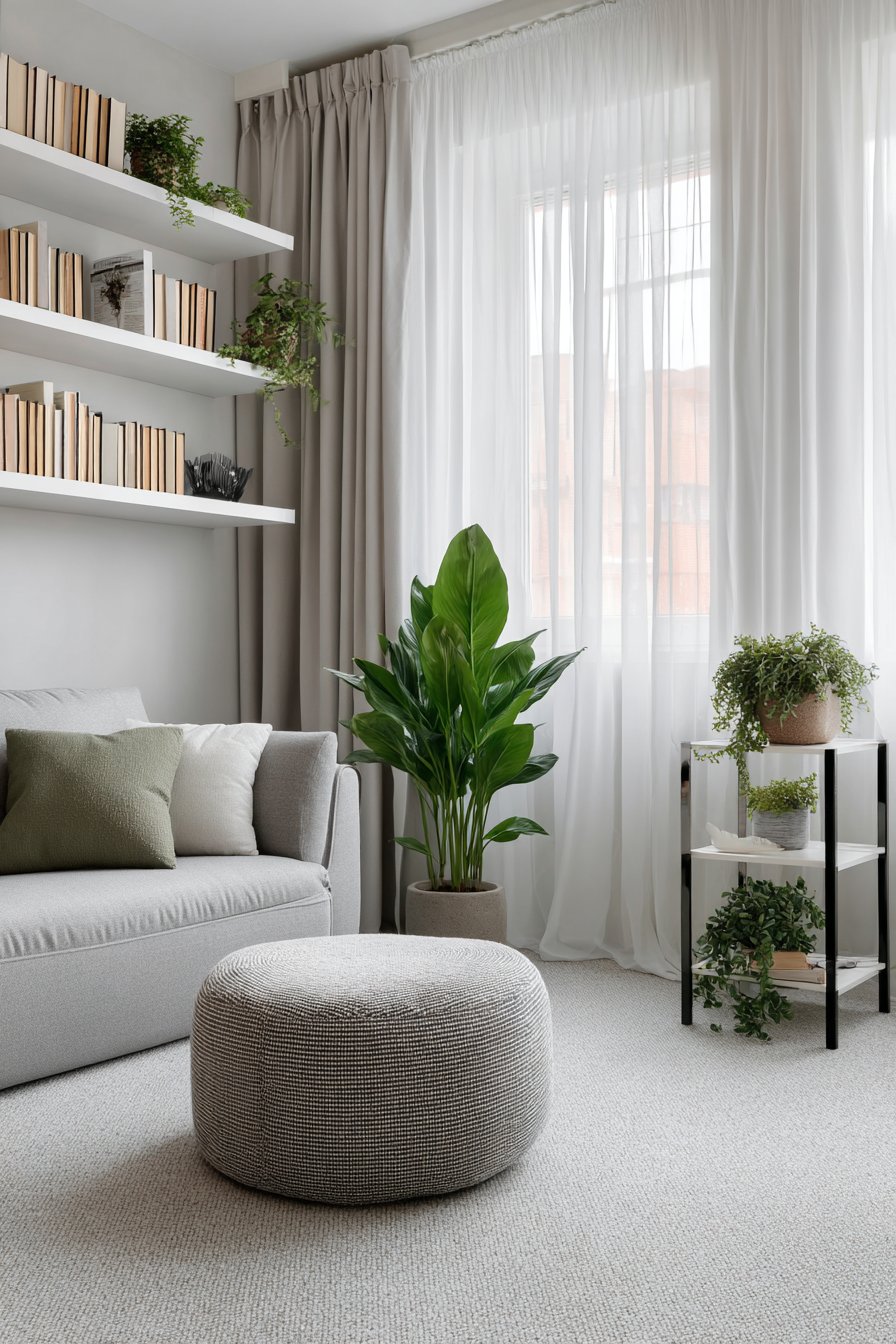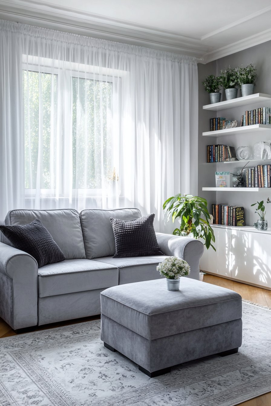 The thoughtfully arranged compact living room demonstrates how white curtains enhance space-conscious design. A grey loveseat scaled appropriately for the room provides comfortable seating without overwhelming the space, while floating shelves mounted on the walls offer storage and display opportunities without consuming floor area. A multi-functional ottoman serves as coffee table, extra seating, and hidden storage—the kind of versatile piece essential in small spaces. The white curtains frame the windows without visual heaviness, their light color and transparent quality keeping the walls from feeling closed in.