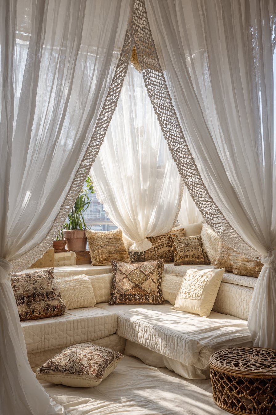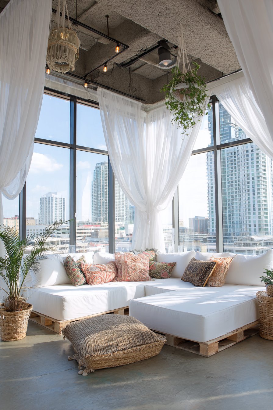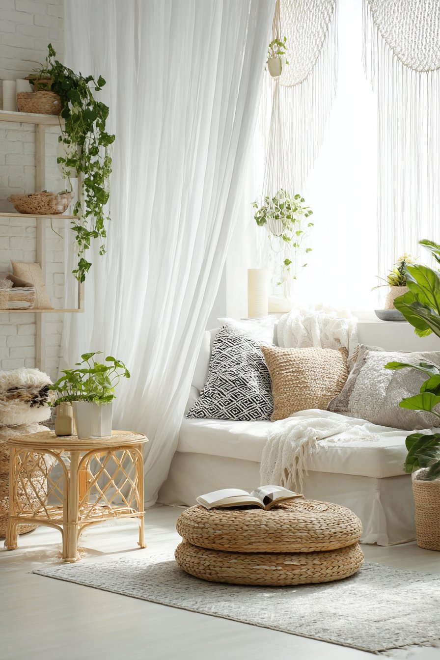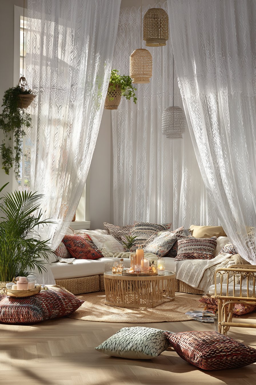 The living room surrounding these artistic curtains layers pattern, texture, and collected treasures in the quintessential bohemian manner. A low-profile sectional upholstered in natural fabric provides ample seating while maintaining the relaxed, floor-focused quality of boho interiors. Mixed pattern throw pillows in earth tones—terracotta, mustard, sage, and burnt sienna—create visual interest without overwhelming the space, their varied textures from velvet to embroidered cotton adding tactile appeal. Rattan furniture pieces introduce natural warmth and organic forms, while hanging plants cascade from ceiling hooks, their trailing vines creating living curtains that complement the white fabric ones.