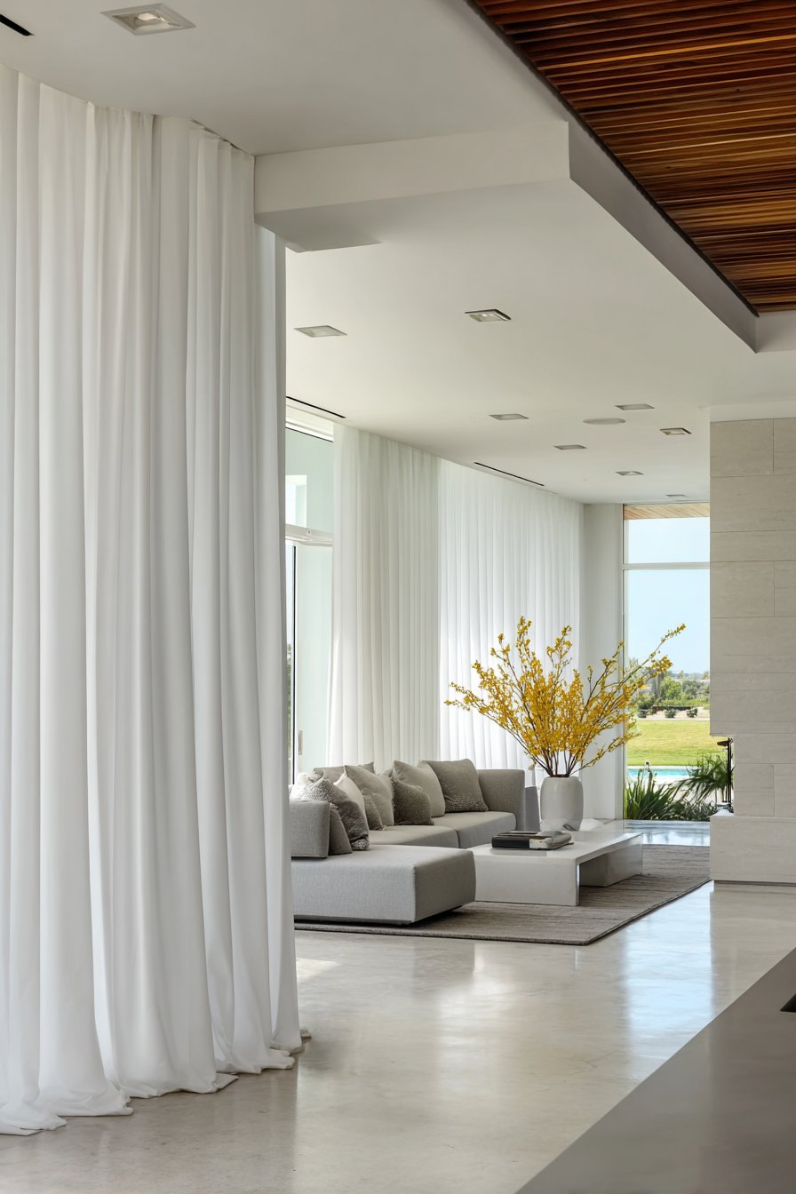 Open-concept living requires creative solutions for defining spaces while maintaining flow, and white linen curtains on ceiling-mounted tracks offer elegant flexibility. These curtains transform from decorative window treatments to functional room dividers, creating privacy or separation when needed while disappearing when open floor plans serve better. The ceiling tracks allow smooth, silent operation, while the white linen maintains visual continuity between spaces rather than creating harsh divisions. This solution provides the adaptability modern living demands without permanent walls that limit future layout changes.