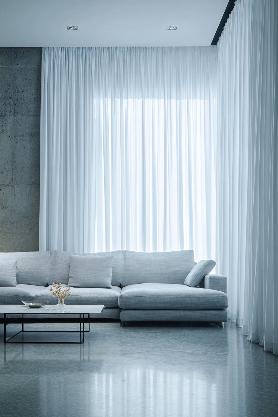 The minimalist living room housing this smart technology reflects contemporary design principles with its emphasis on clean lines and uncluttered spaces. A low-profile grey sofa floats in the space rather than pushing against walls, its simple form requiring no decorative details because its proportions and upholstery quality speak for themselves. A glass coffee table virtually disappears, maintaining sight lines and preventing visual clutter, while polished concrete floors provide an industrial edge that balances the softness of the white curtains. Recessed lighting throughout ensures even illumination without visible fixtures, maintaining the streamlined aesthetic.