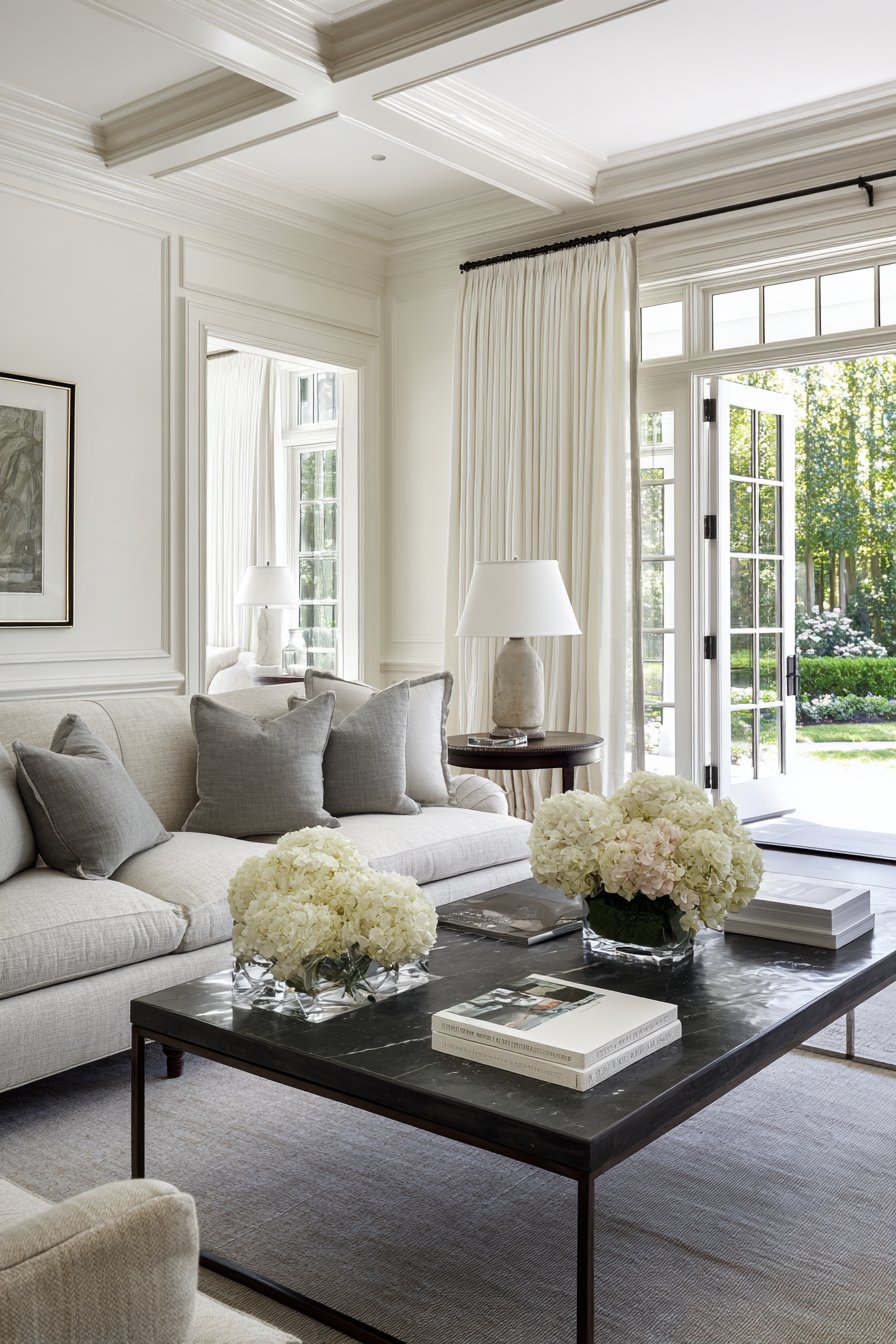 The living room showcasing these versatile curtains demonstrates transitional design’s fundamental principle: harmonizing elements from different style eras. A rolled-arm sofa upholstered in soft grey fabric represents traditional comfort with its classic silhouette, while a contemporary glass and metal coffee table introduces modern transparency and reflective surfaces. Table lamps with traditional turned bases topped by clean drum shades bridge both aesthetics. The white grommet curtains serve as neutral mediators, their simple elegance complementing both traditional and modern elements without favoring either direction.