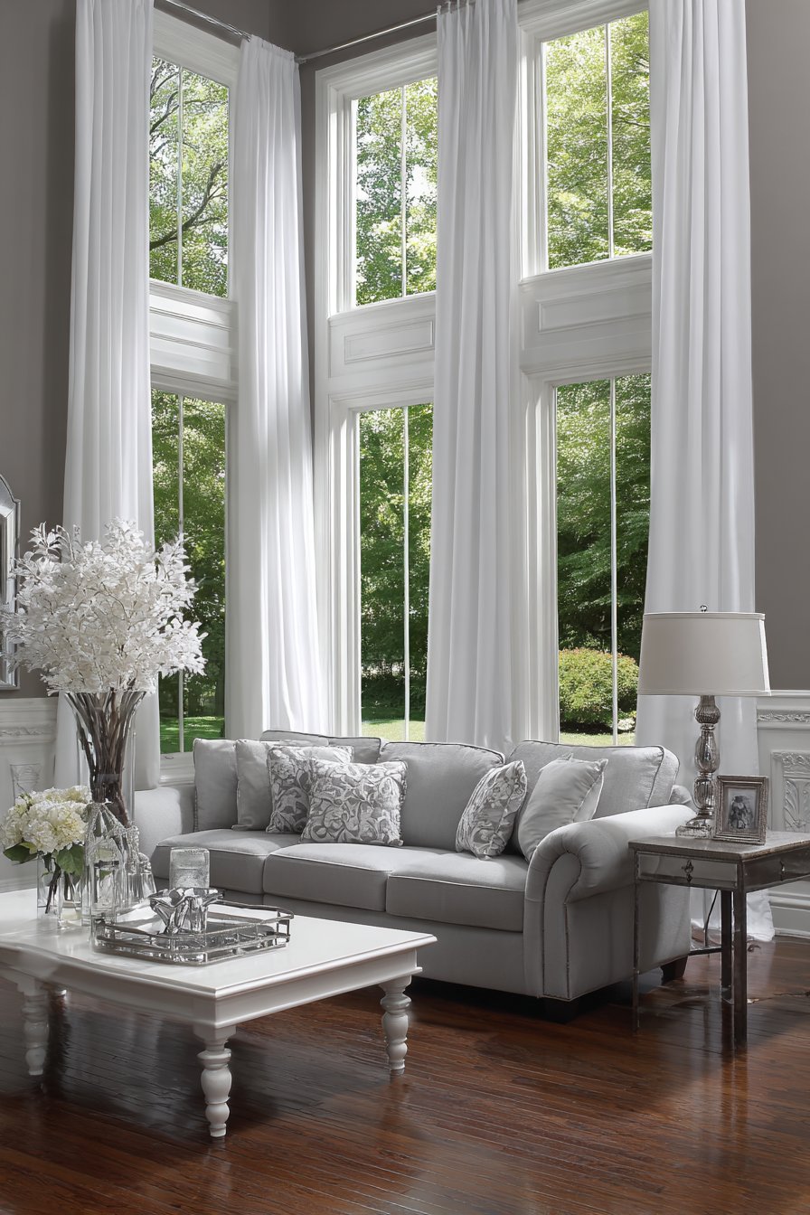 Sophisticated window dressing reaches new heights when sheer white voile curtains are paired with heavier white cotton drapes on a dual rod system. This layered approach offers both aesthetic appeal and practical functionality, allowing homeowners to adjust light levels and privacy throughout the day. The sheer inner layer provides daytime privacy while maintaining visibility and light transmission, while the outer cotton drapes can be drawn for complete privacy, light blocking, or simply to create a more formal, finished appearance during evening hours.
